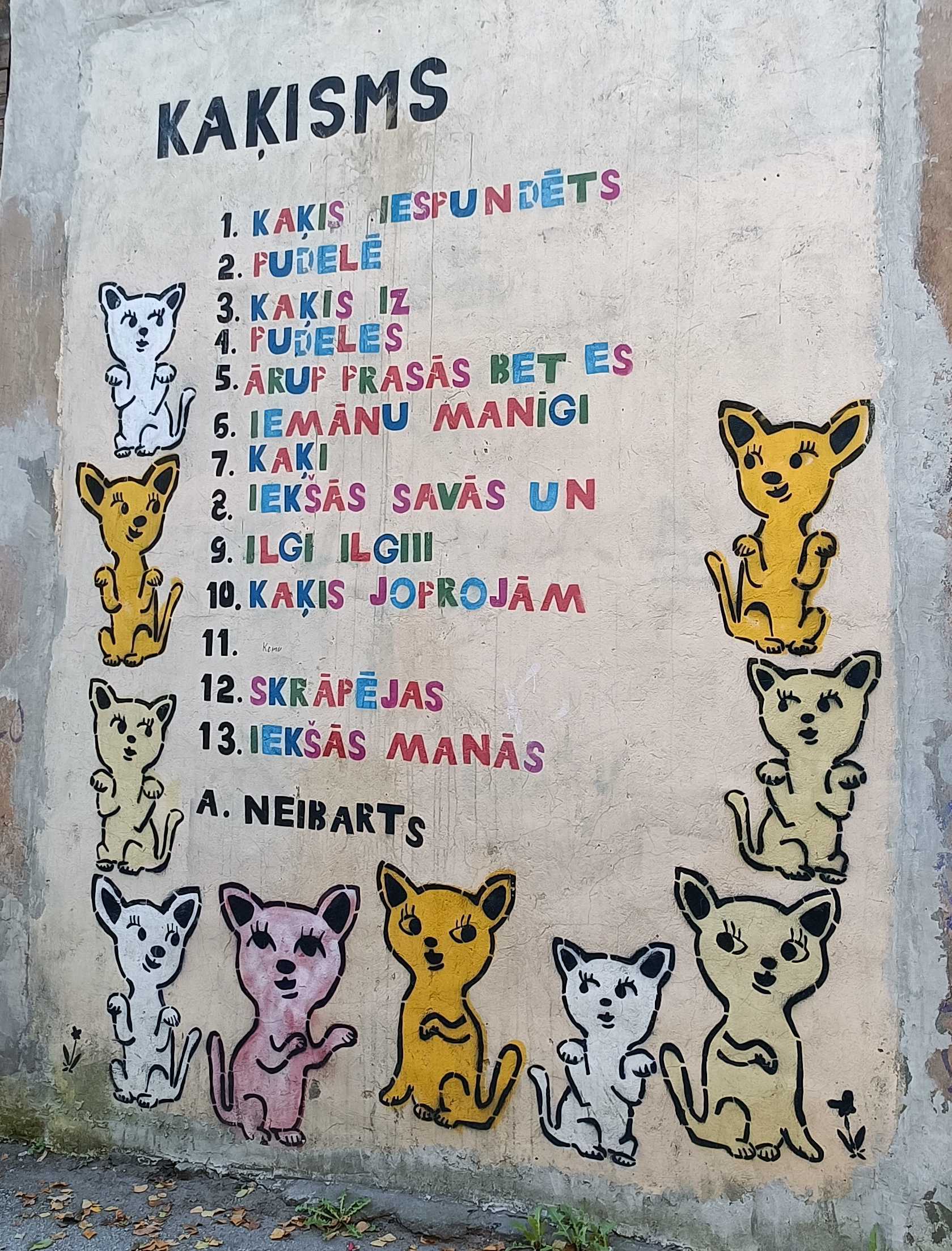 The artwork is of graffiti type. You can admire it in the city of Rīga in Latvia and more precisely here : Priežu iela 6/8, Ziemeļu rajons, Rīga, LV-1005, Latvia.