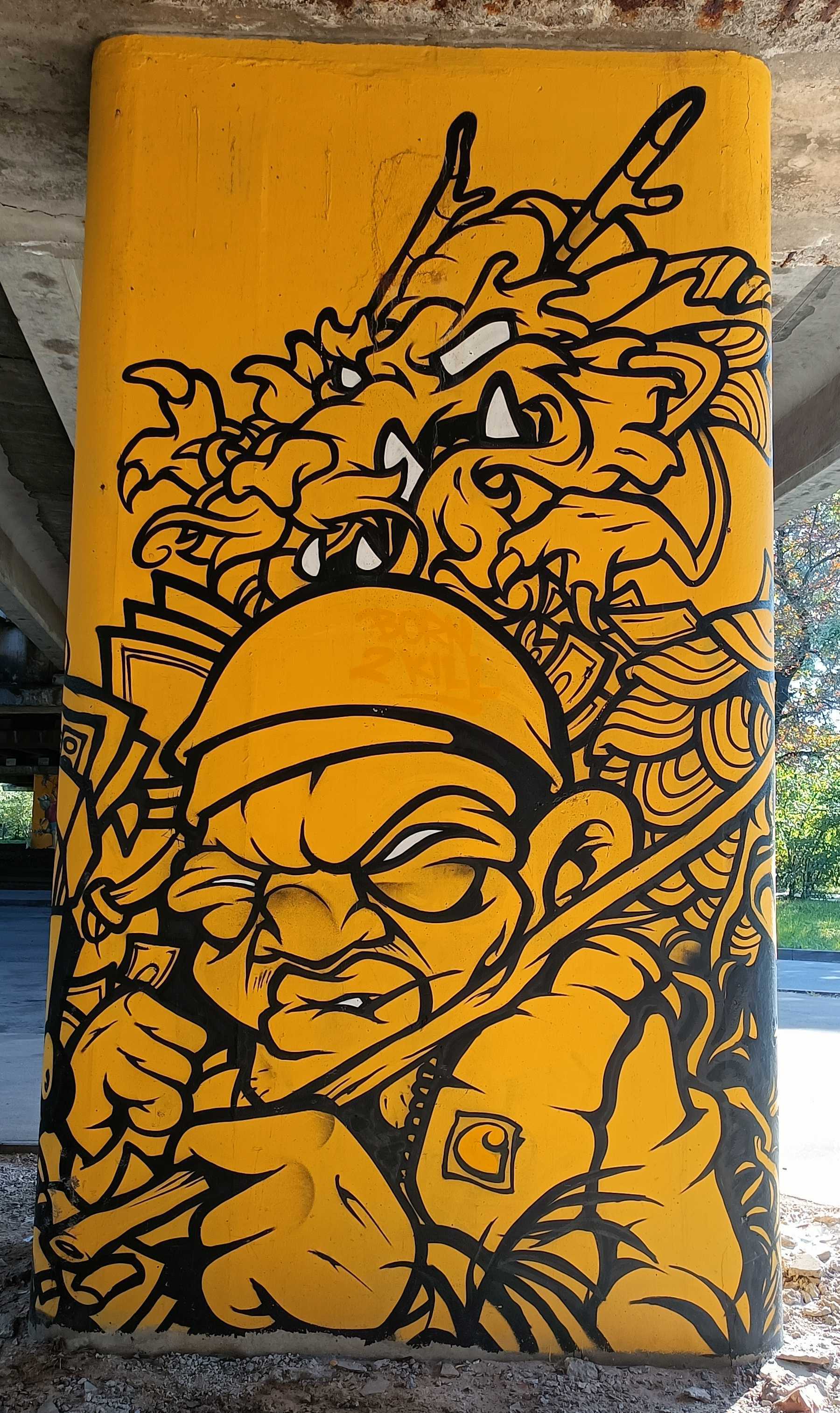 The artwork is of graffiti type. You can admire it in the city of Rīga in Latvia and more precisely here : Čiekurkalna 1. līnija 14, Vidzemes priekšpilsēta, Rīga, LV-1026, Latvia.