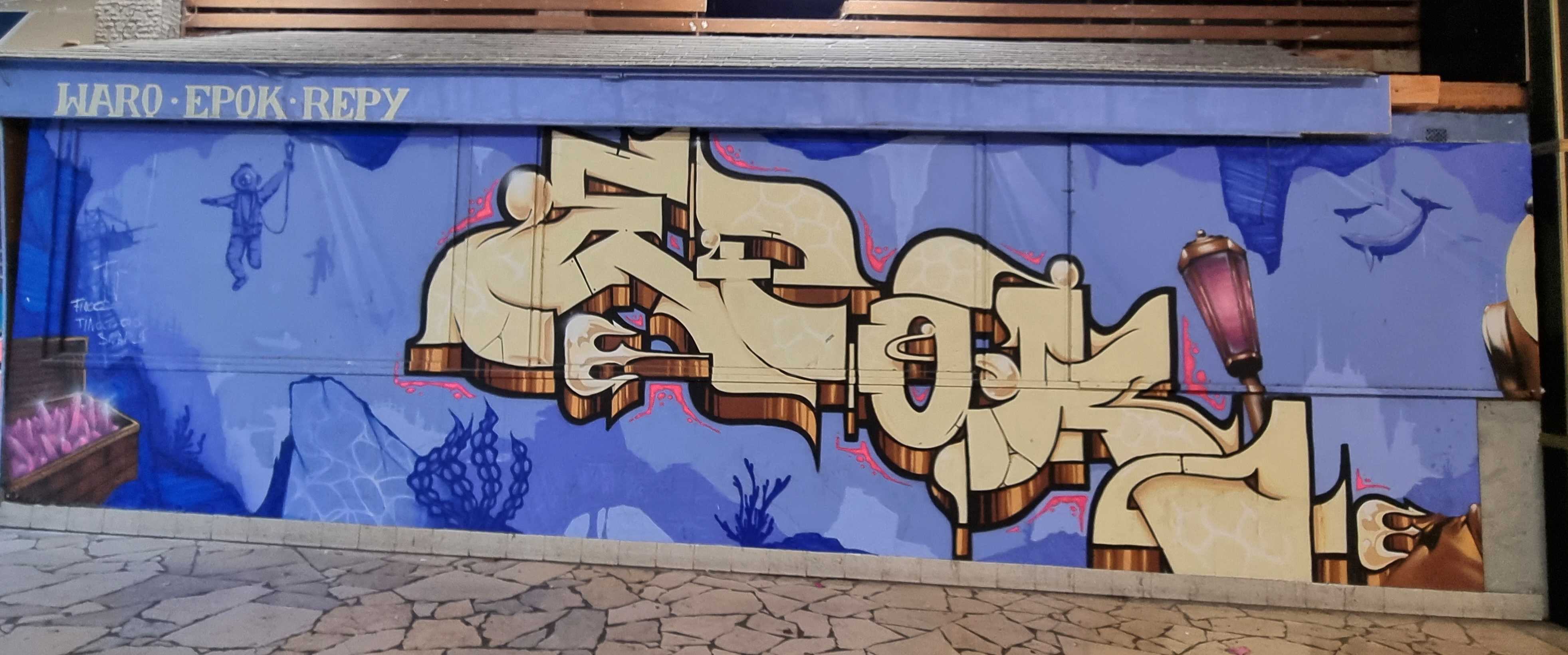 The artwork is of graffiti type. You can admire it in the city of Vichy in France and more precisely here : 1 Rue Nicolas Larbaud, 03200 Vichy, France.