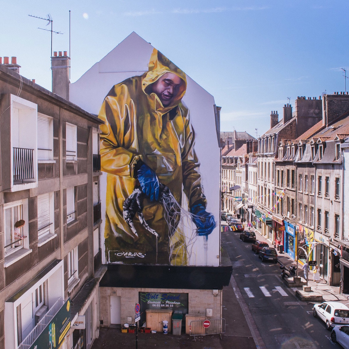 The artwork is of graffiti type. You can admire it in the city of Boulogne sur Mer in France and more precisely here : 122 rue Faidherbe.