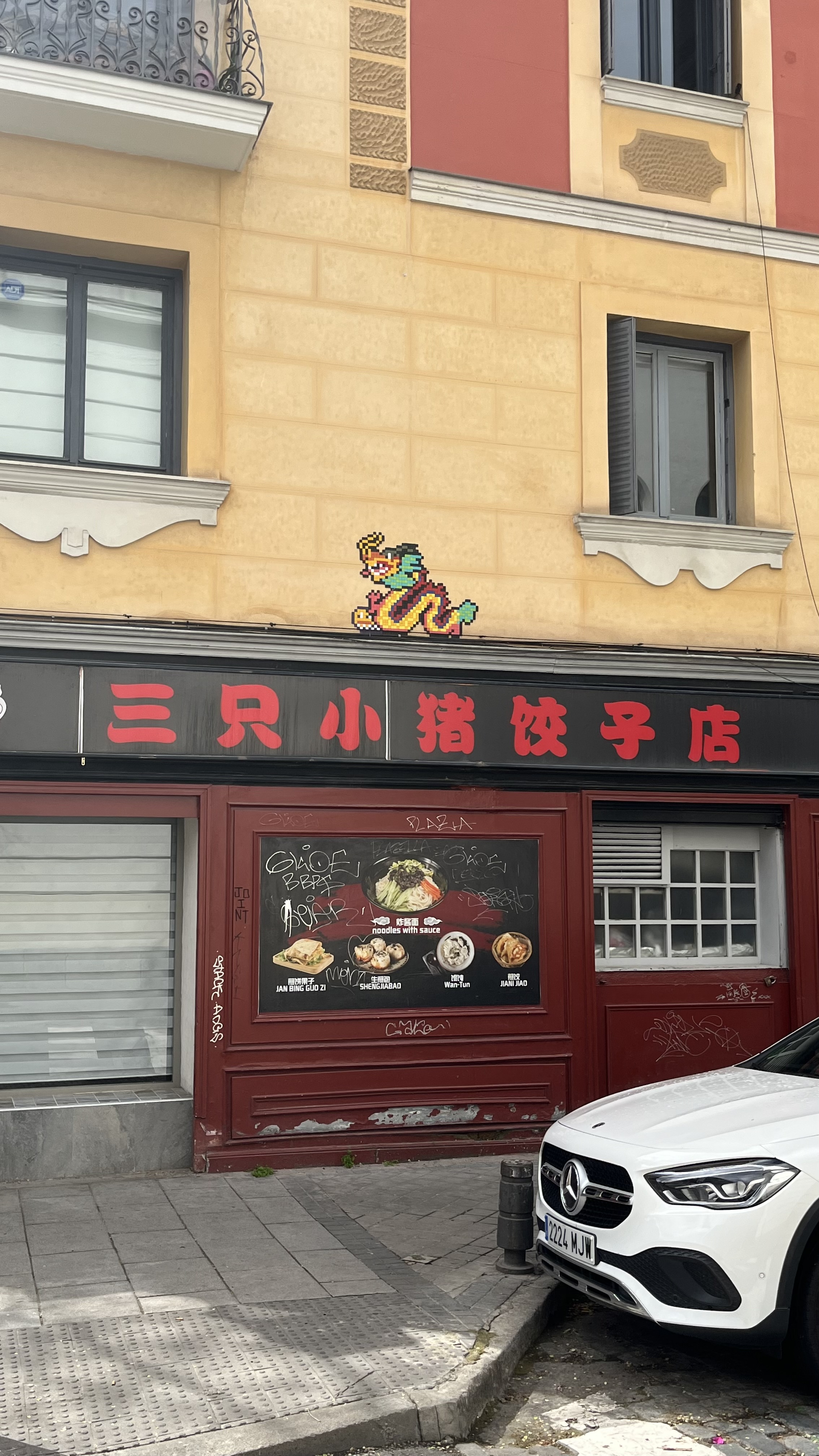 The artwork is of mosaic type. You can admire it in the city of Madrid in Spain and more precisely here : C. de Don Pedro, 13, Centro, 28005 Madrid, Spain.