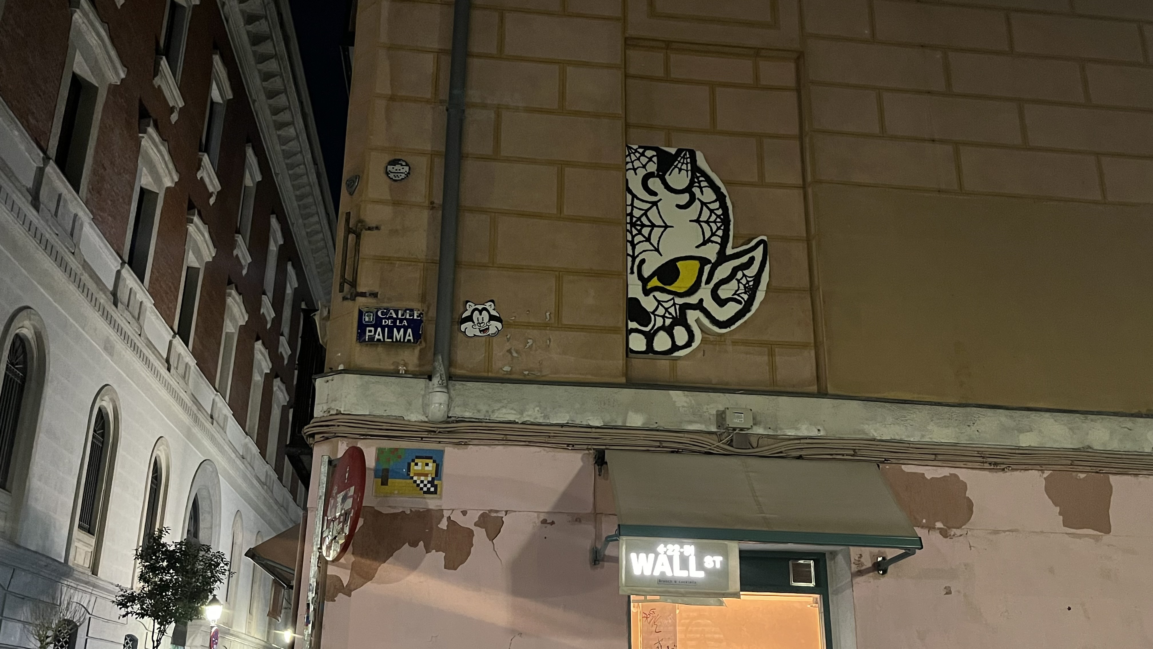 The artwork is of sticking type. You can admire it in the city of Madrid in Spain and more precisely here : Corre. Alta de San Pablo, 27, Centro, 28004 Madrid, Spain.