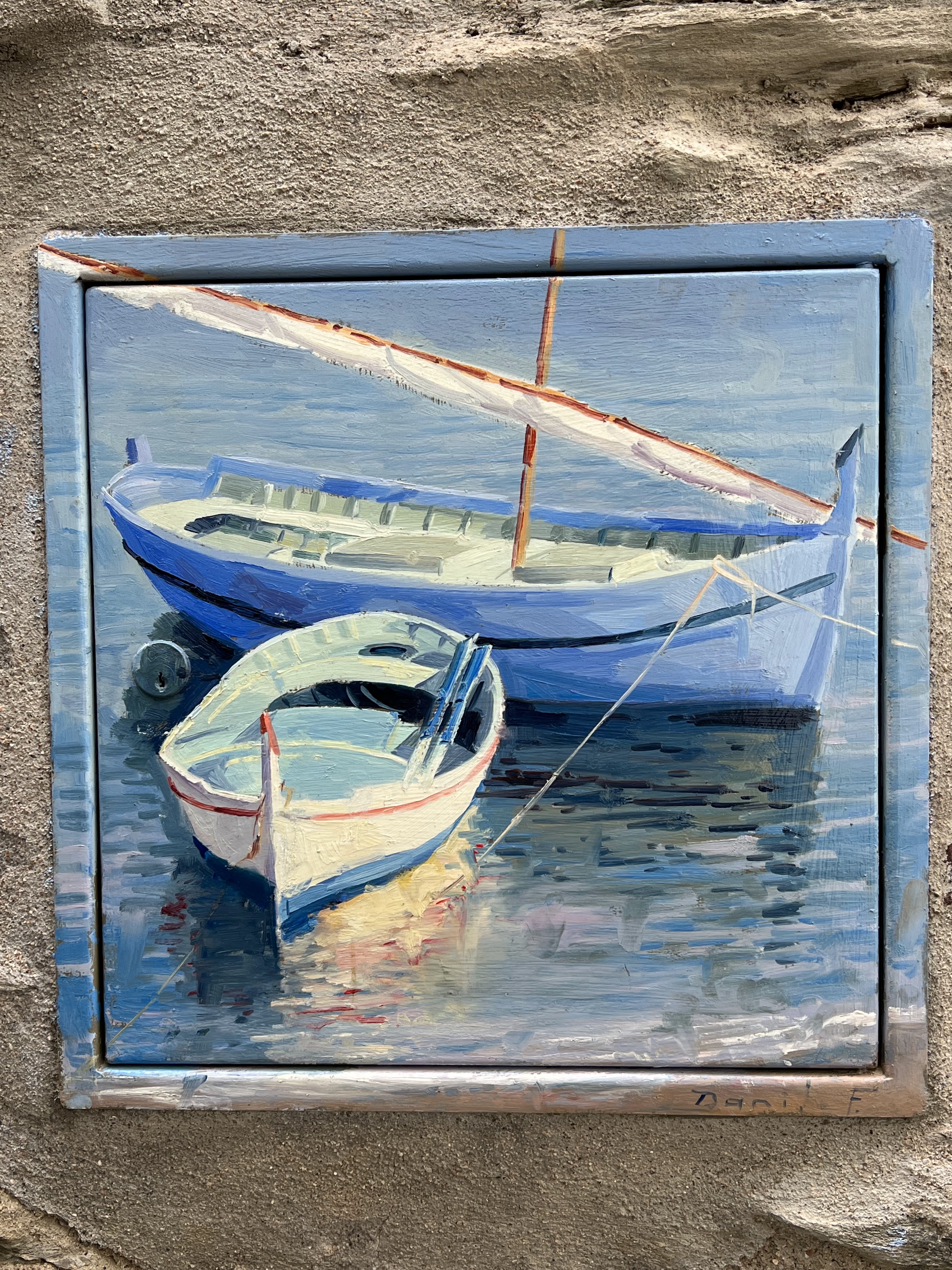 The artwork is of graffiti type. You can admire it in the city of Cadaqués in Spain and more precisely here : Carrer de l'Església, 6, 17488 Cadaqués, Girona, Spain.