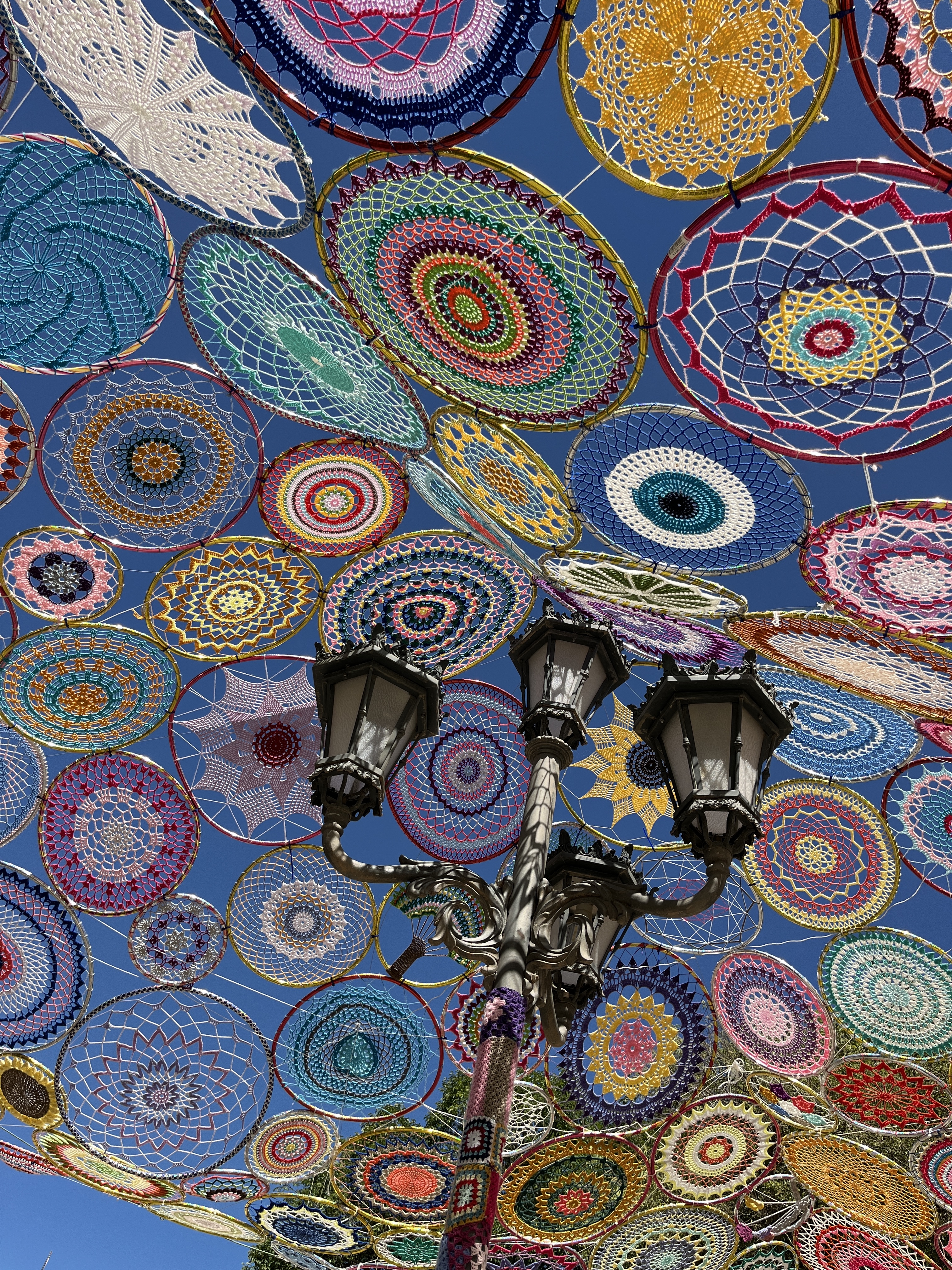 The artwork is of yarn_bombing type. You can admire it in the city of Ronda in Spain and more precisely here : Pl. Ruedo Alameda, 28, 29400 Ronda, Málaga, Spain.