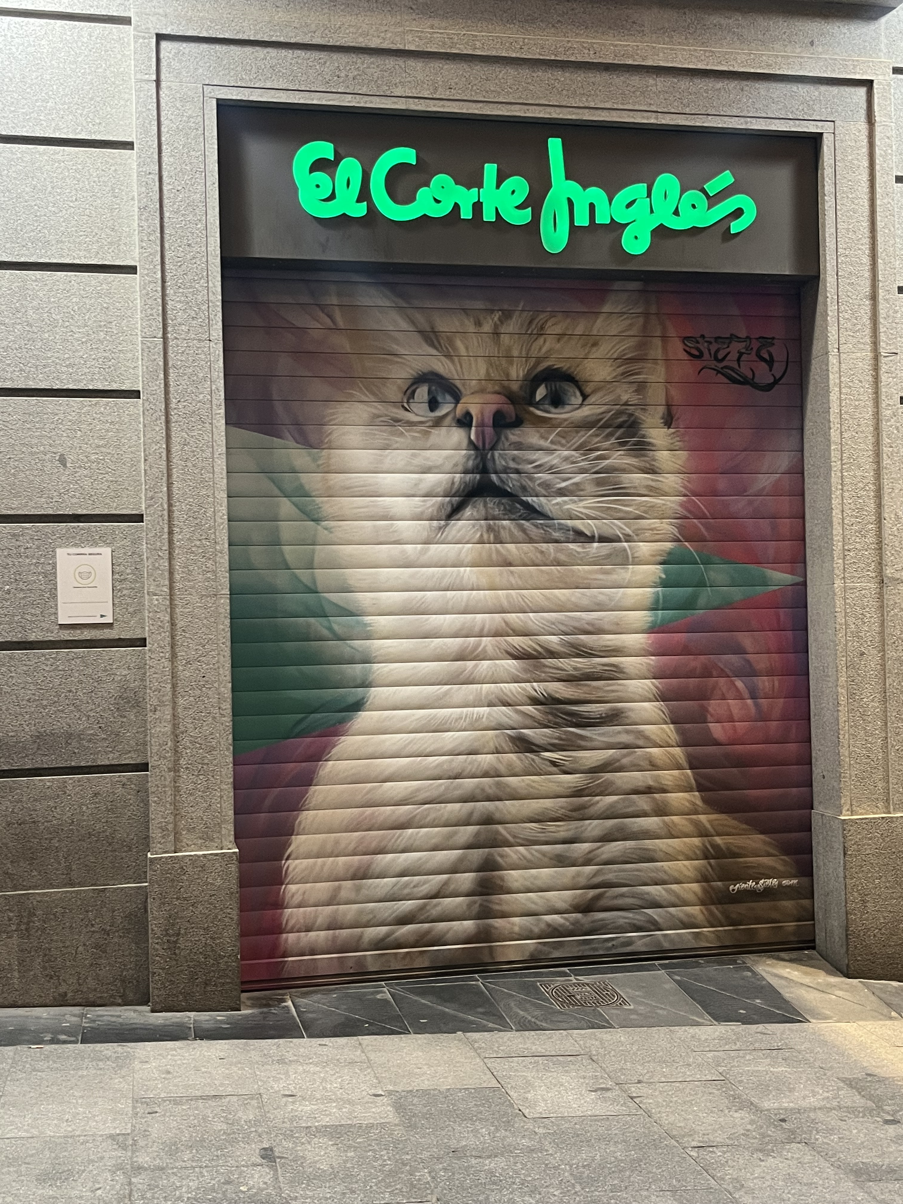 The artwork is of graffiti type. You can admire it in the city of Madrid in Spain and more precisely here : C. del Maestro Victoria, 14, Centro, 28013 Madrid, Spain.