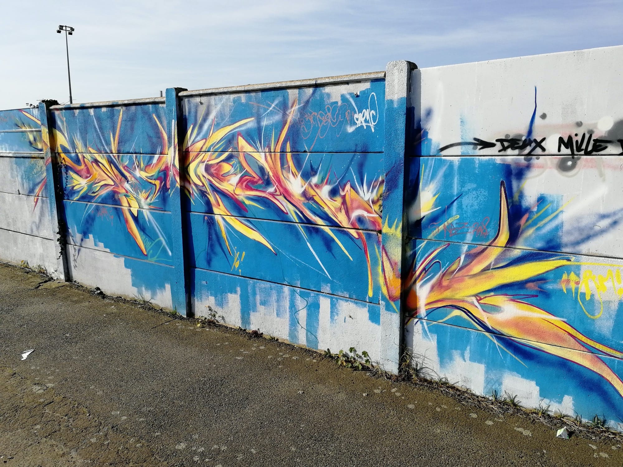 The artwork is of graffiti type. You can admire it in the city of Saint-Nazaire in France and more precisely here : 2 Quai des Frégates, 44600 Saint-Nazaire, France.