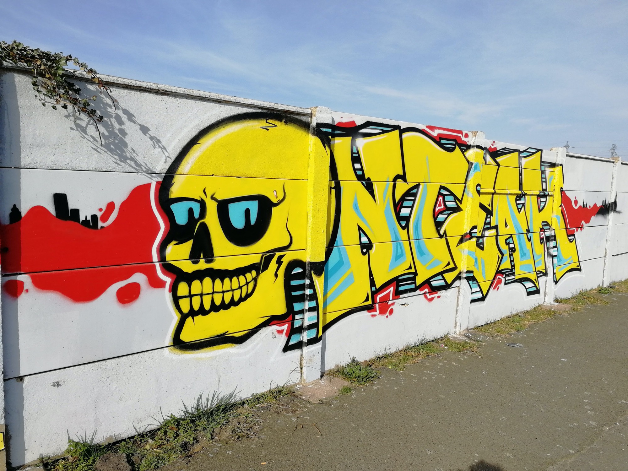 The artwork Skull is of graffiti type. You can admire it in the city of Saint-Nazaire in France and more precisely here : 200 Boulevard Paul Leferme, 44600 Saint-Nazaire, France.