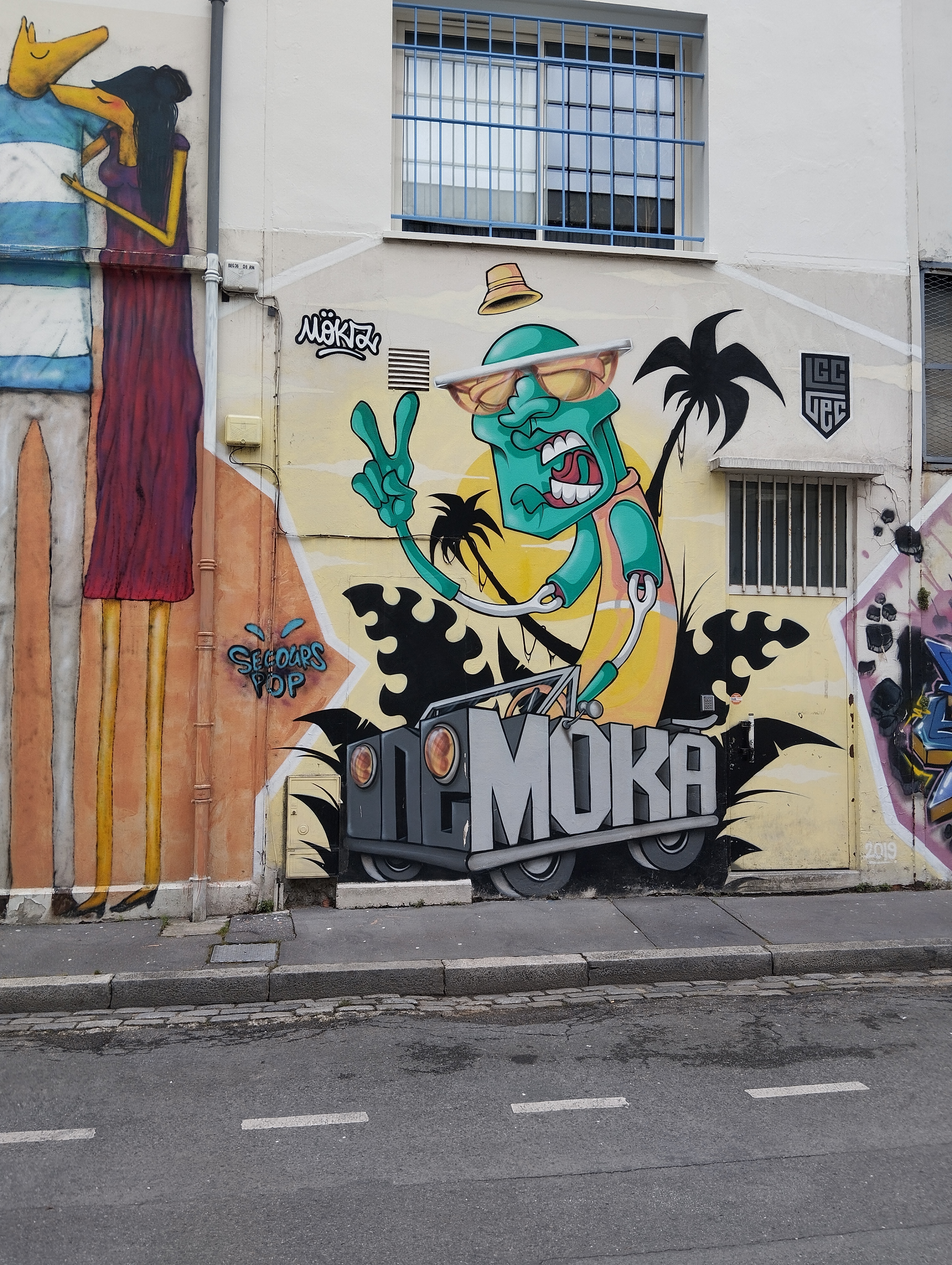 The artwork is of graffiti type. You can admire it in the city of Bordeaux in France and more precisely here : 95 Quai de Paludate, 33800 Bordeaux, France.