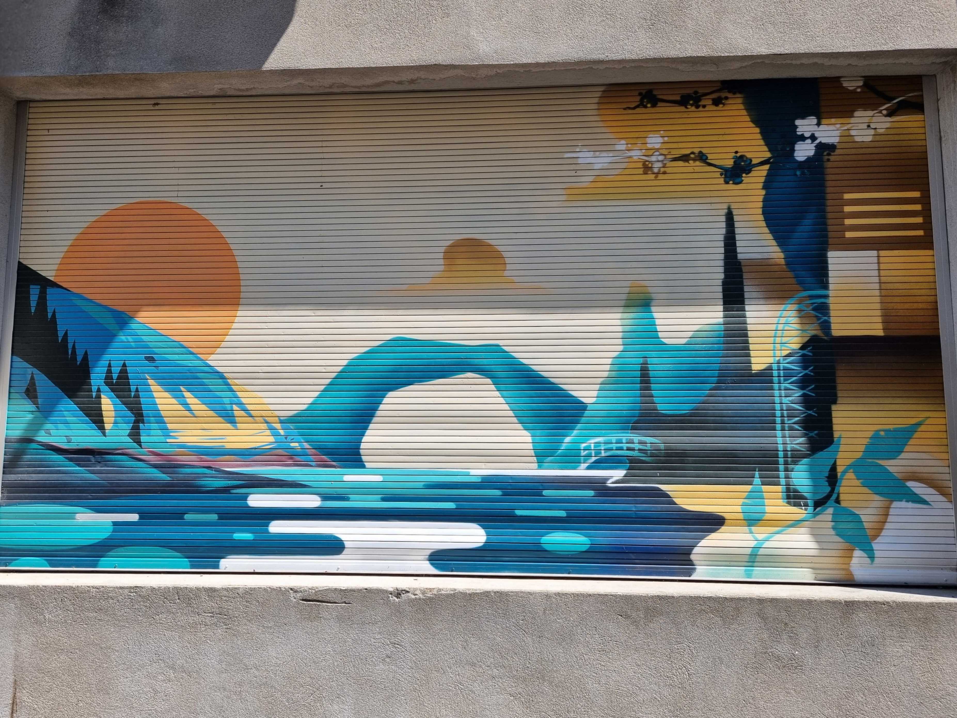 The artwork is of graffiti type. You can admire it in the city of Vallon-Pont-d'Arc in France and more precisely here : 14 Bd Peschaire Alizon, 07150 Vallon-Pont-d'Arc, France.