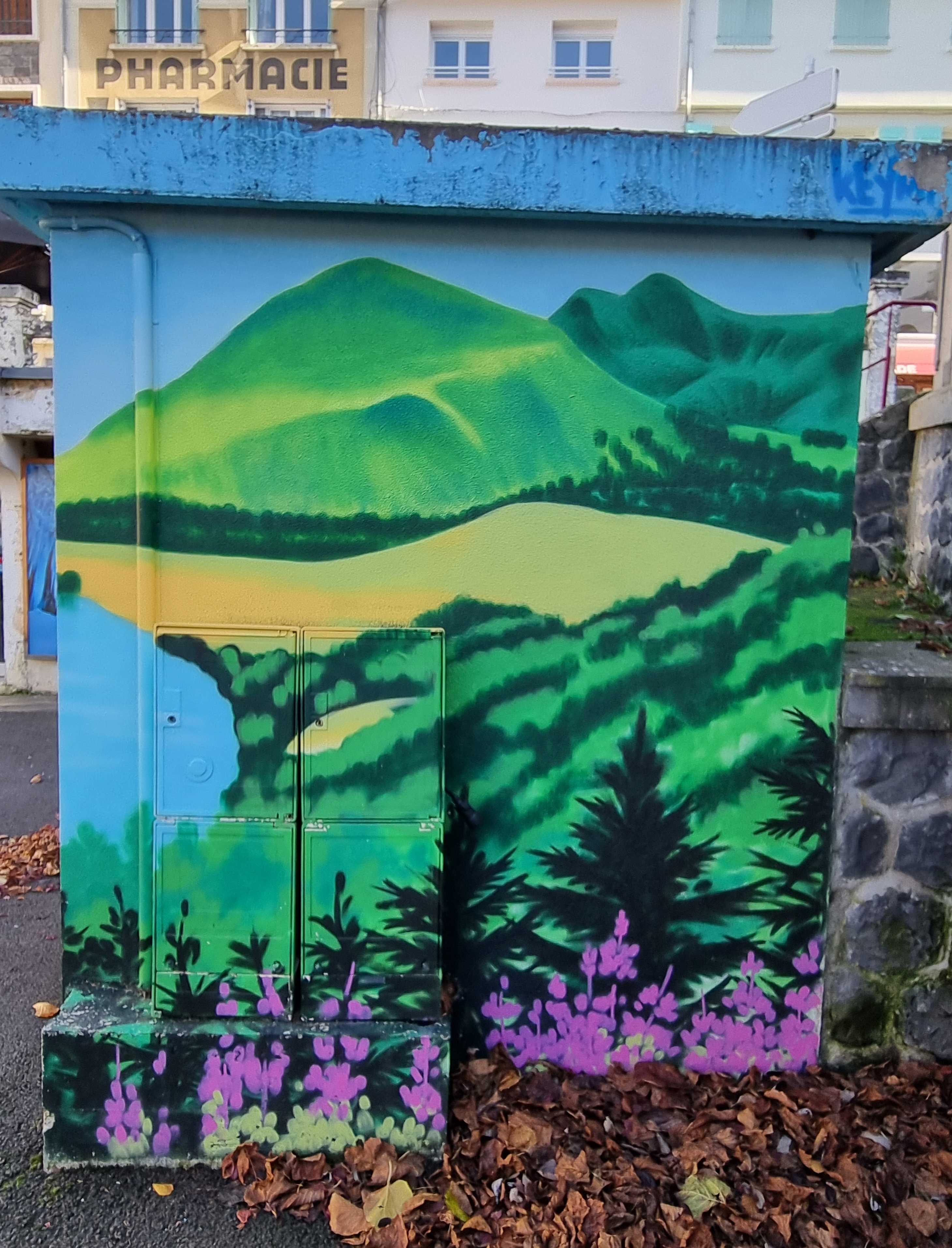 The artwork is of graffiti type. You can admire it in the city of Mont-Dore in France and more precisely here : 1 Rue Côte Boissy, 63240 Mont-Dore, France.