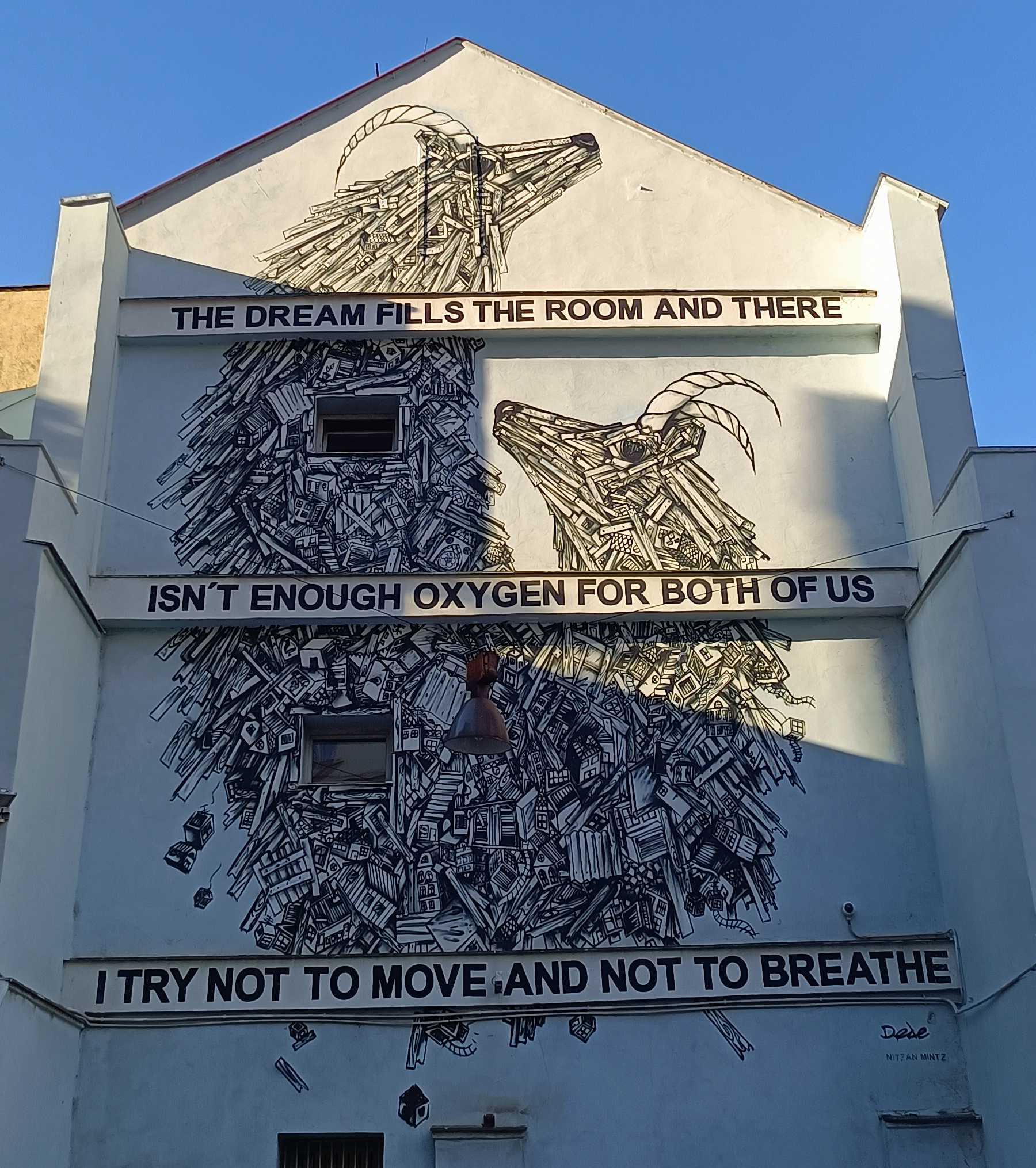 The artwork is of graffiti type. You can admire it in the city of Hlavní město Praha in Czechia and more precisely here : Štítného 629/23, 130 00 Praha 3-Žižkov, Czechia.