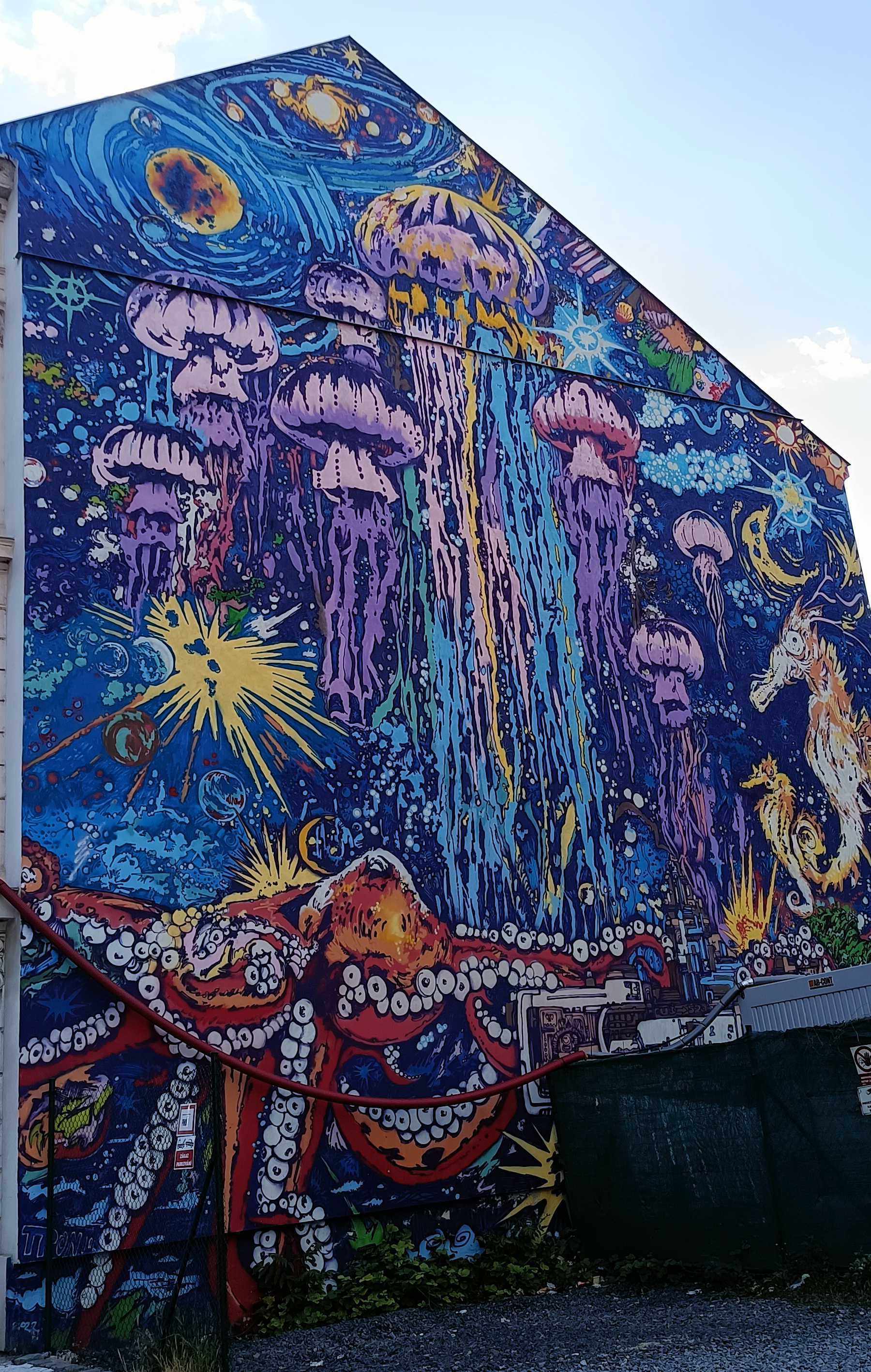 The artwork is of graffiti type. You can admire it in the city of Hlavní město Praha in Czechia and more precisely here : Křižíkova 148/34, 186 00 Praha 8-Karlín, Czechia.