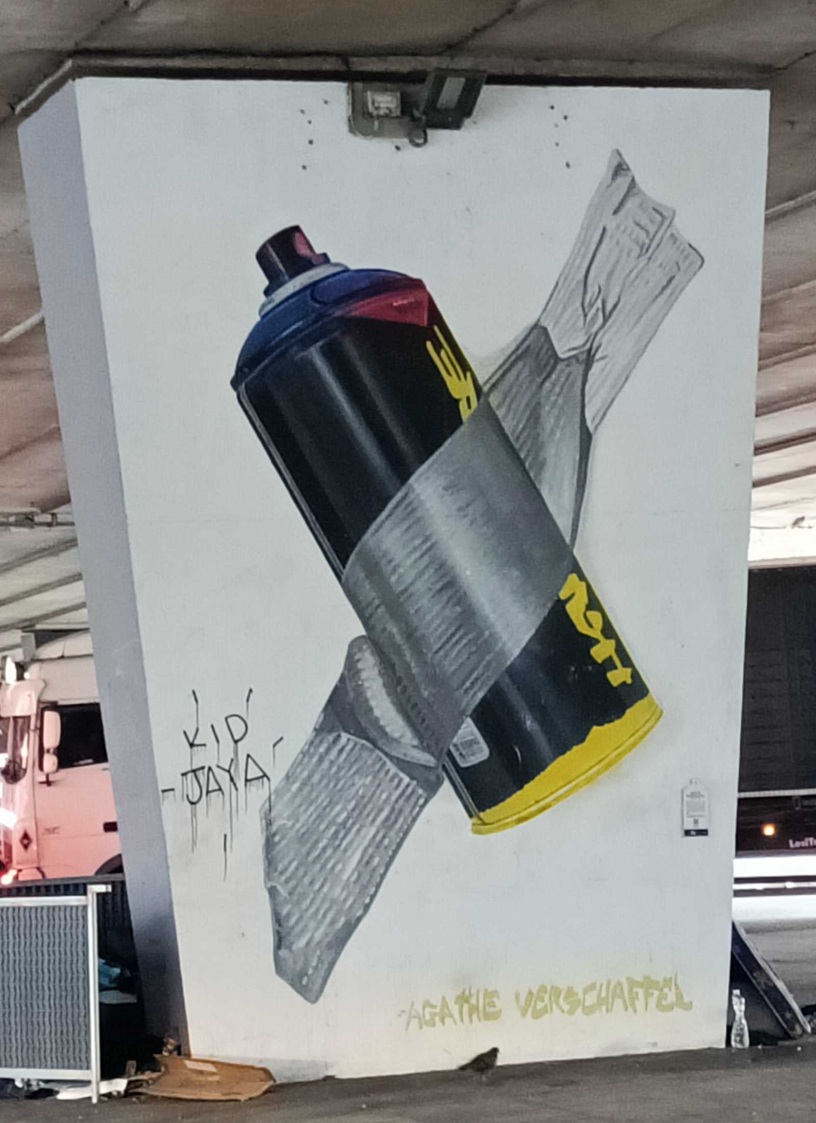 The artwork is of graffiti type. You can admire it in the city of Clichy in France and more precisely here : 15 Bd Victor Hugo, 92110 Clichy, France.
