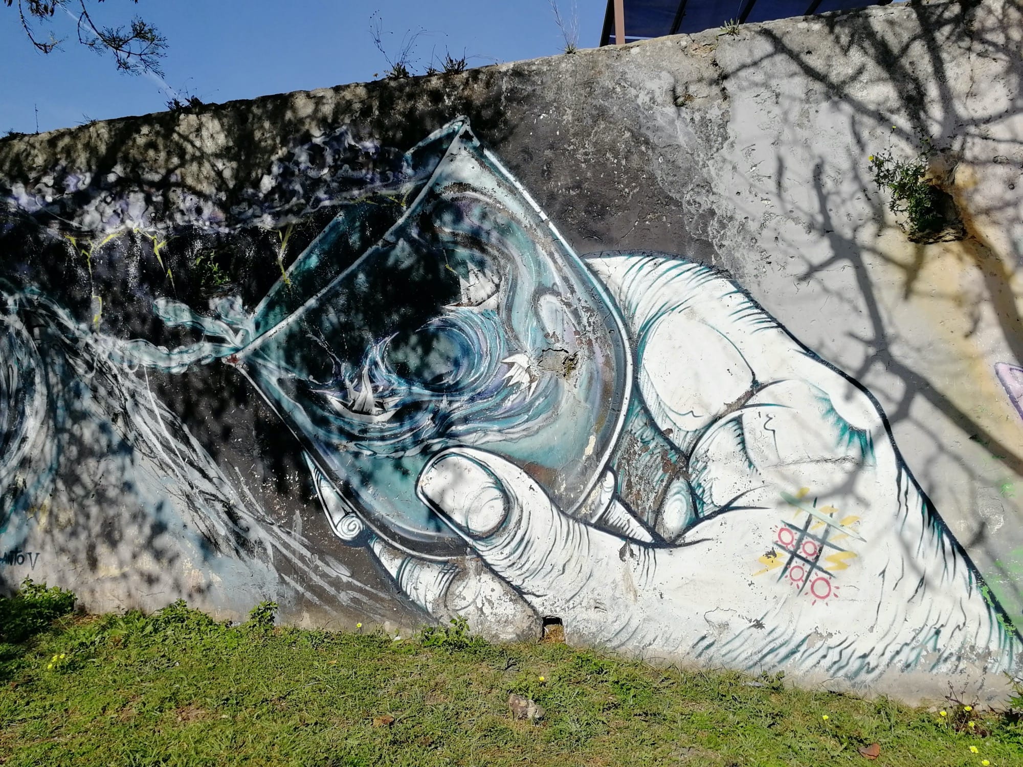 The artwork is of graffiti type. You can admire it in the city of Lisboa in Portugal and more precisely here : Belem, 1300-300 Lisboa, Portugal.