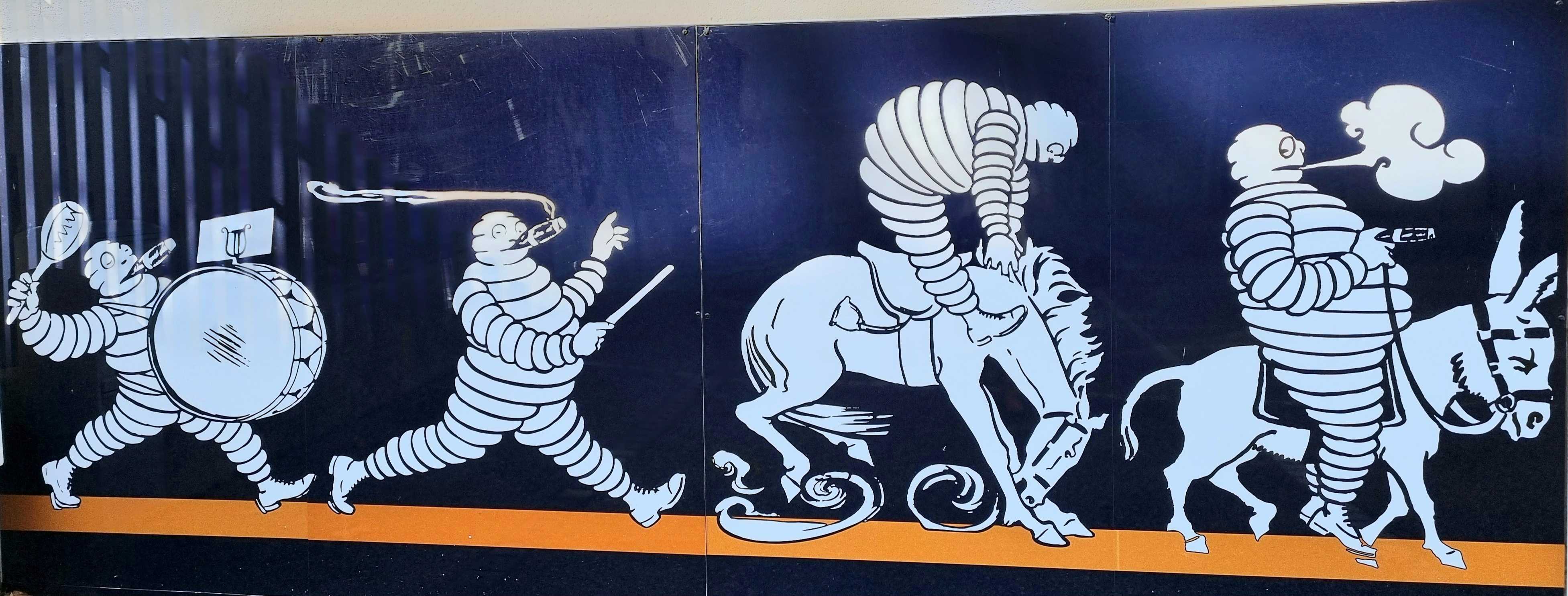 The artwork Michelin is of graffiti type. You can admire it in the city of Clermont-Ferrand in France and more precisely here : Tribune Phliponeau, 12 Rue du Clos Four, 63100 Clermont-Ferrand, France.