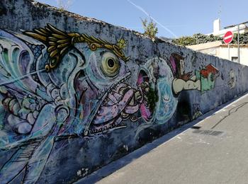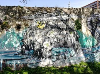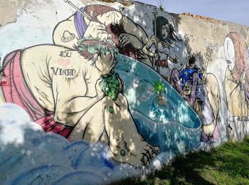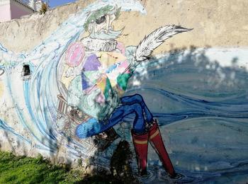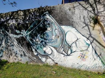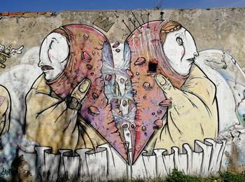 The artwork is of graffiti type. You can admire it in the city of Lisboa in Portugal and more precisely here : R. Alexandre de Sá Pinto 13A, 1300-598 Lisboa, Portugal.