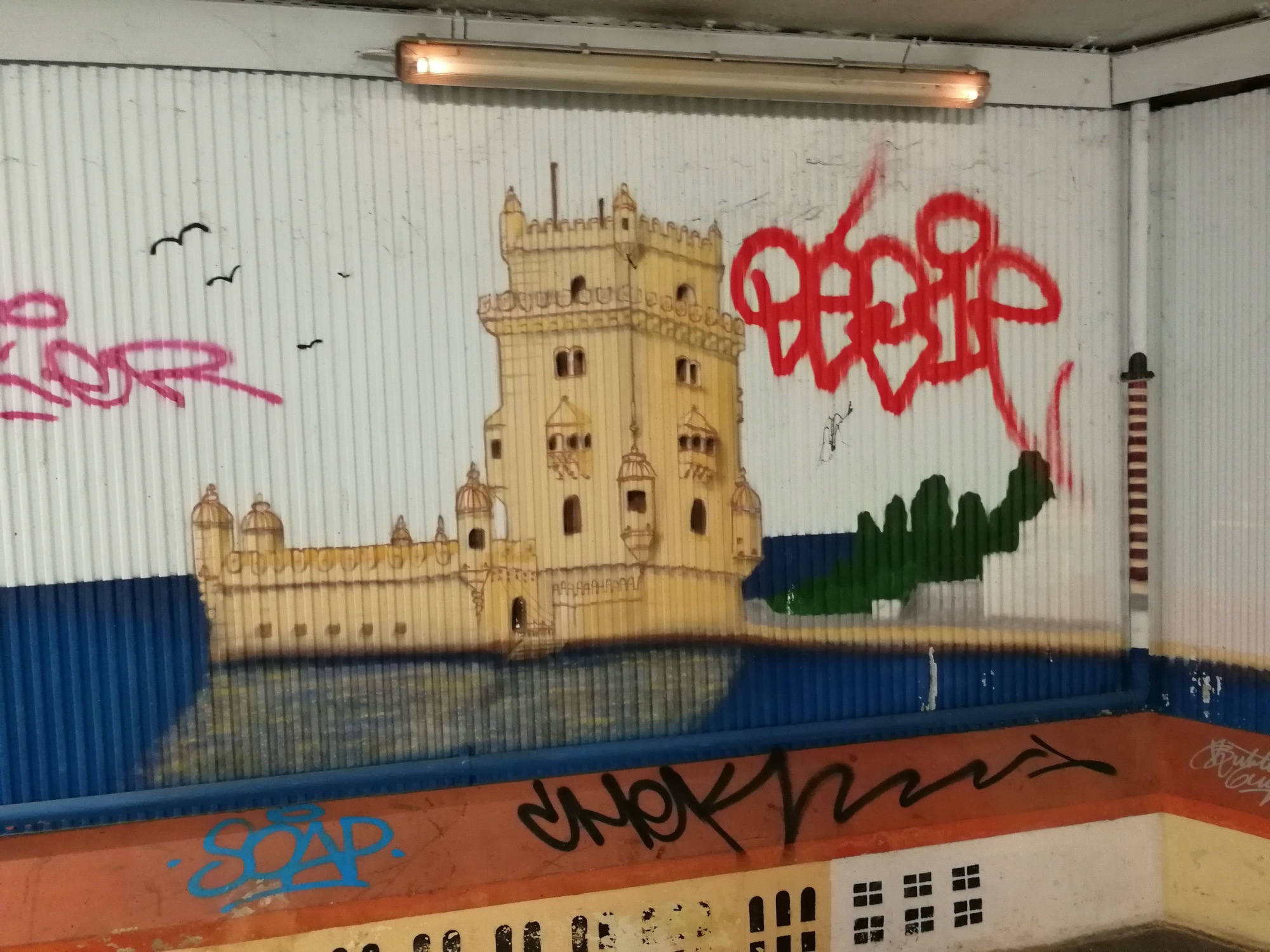 The artwork is of graffiti type. You can admire it in the city of Lisboa in Portugal and more precisely here : R. Cozinha Económica 5, 1300-023 Lisboa, Portugal.