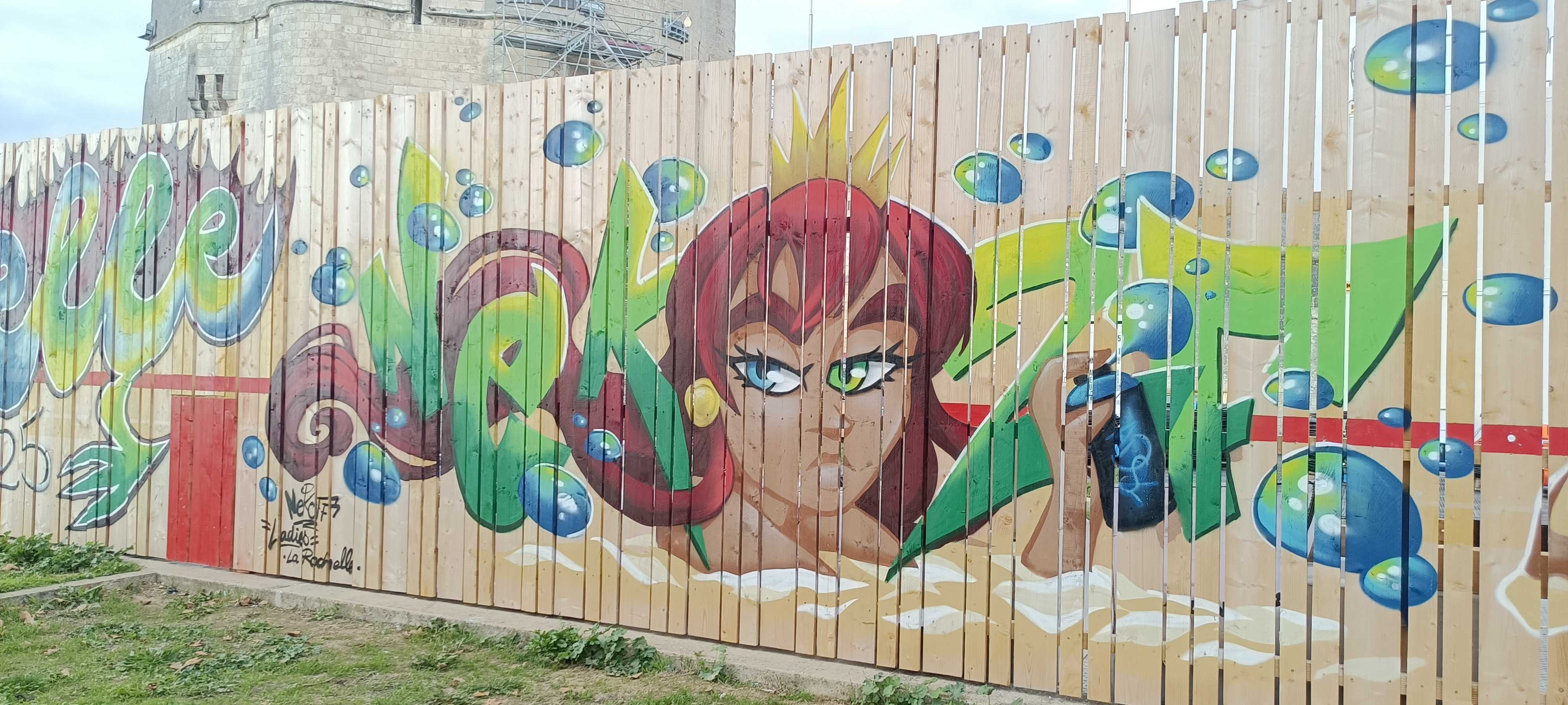 The artwork is of graffiti type. You can admire it in the city of La Rochelle in France and more precisely here : 65 Quai Louis Prunier, 17000 La Rochelle, France.
