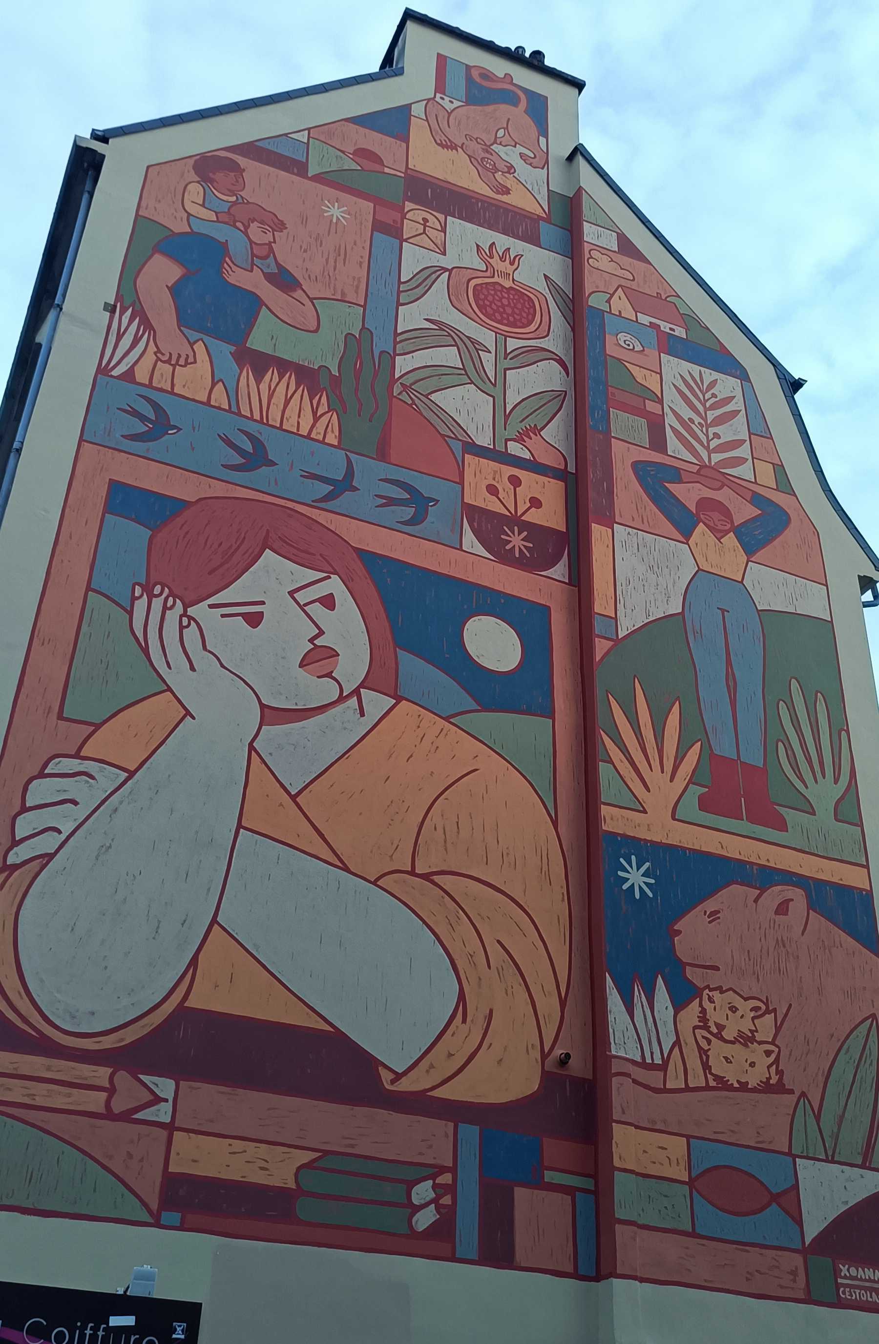 The artwork is of graffiti type. You can admire it in the city of Rennes in France and more precisely here : 59 Rue Saint-Hélier, 35000 Rennes, France.