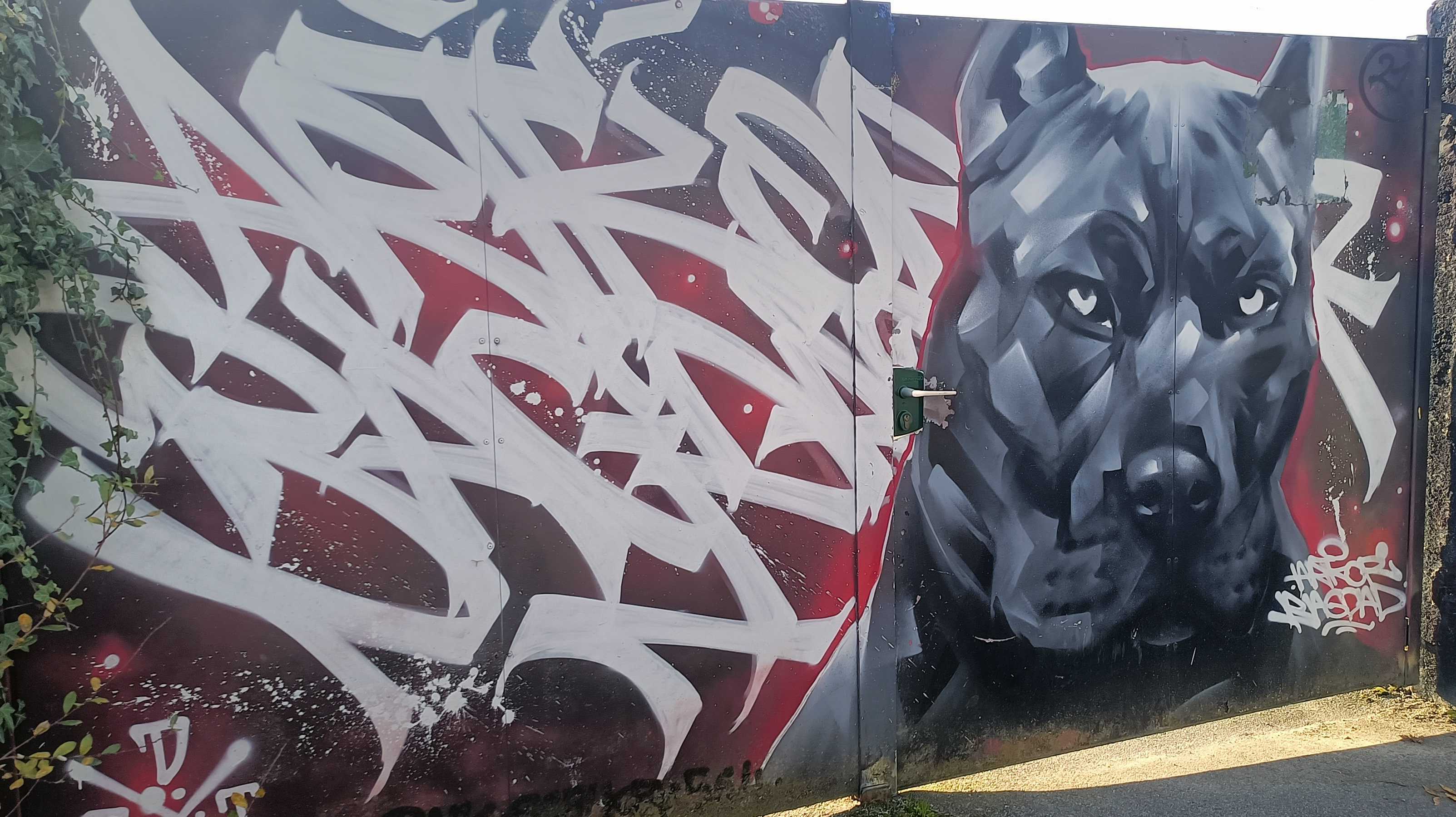 The artwork is of graffiti type. You can admire it in the city of Rennes in France and more precisely here : Mille Pas Garden, Chem. Robert de Boron, 35000 Rennes, France.