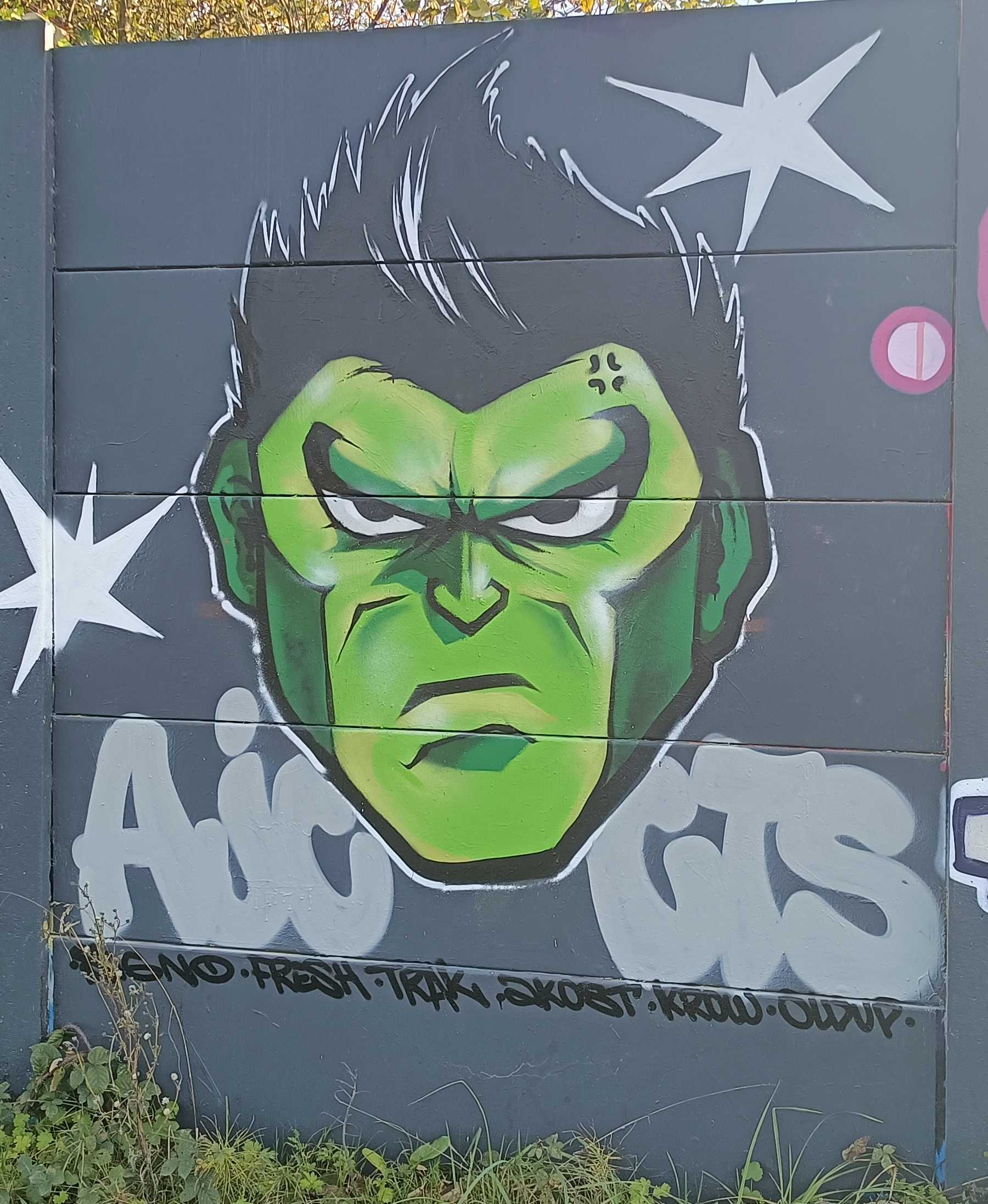 The artwork is of graffiti type. You can admire it in the city of Rennes in France and more precisely here : 564 Rte de Sainte-Foix, 35000 Rennes, France.
