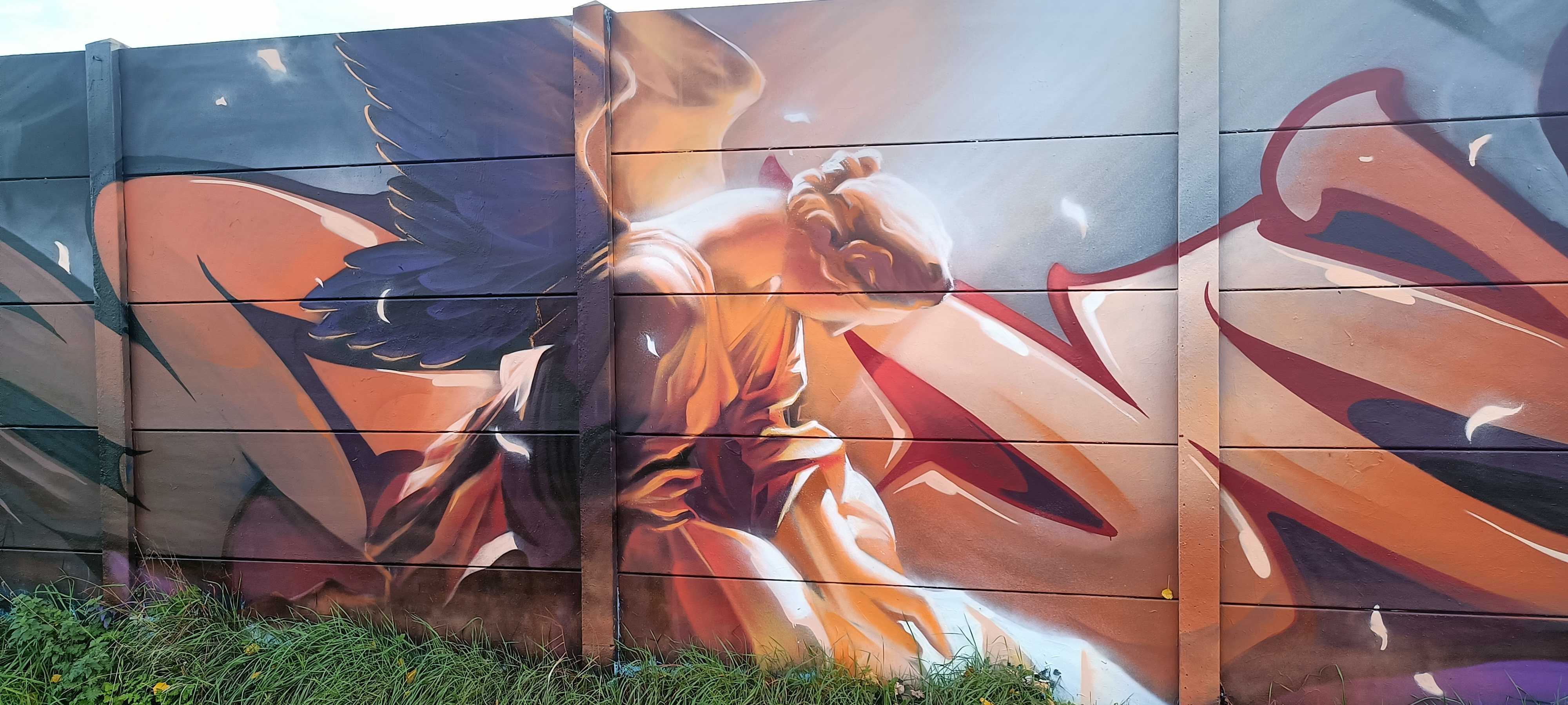 The artwork is of graffiti type. You can admire it in the city of Rennes in France and more precisely here : 564 Rte de Sainte-Foix, 35000 Rennes, France.