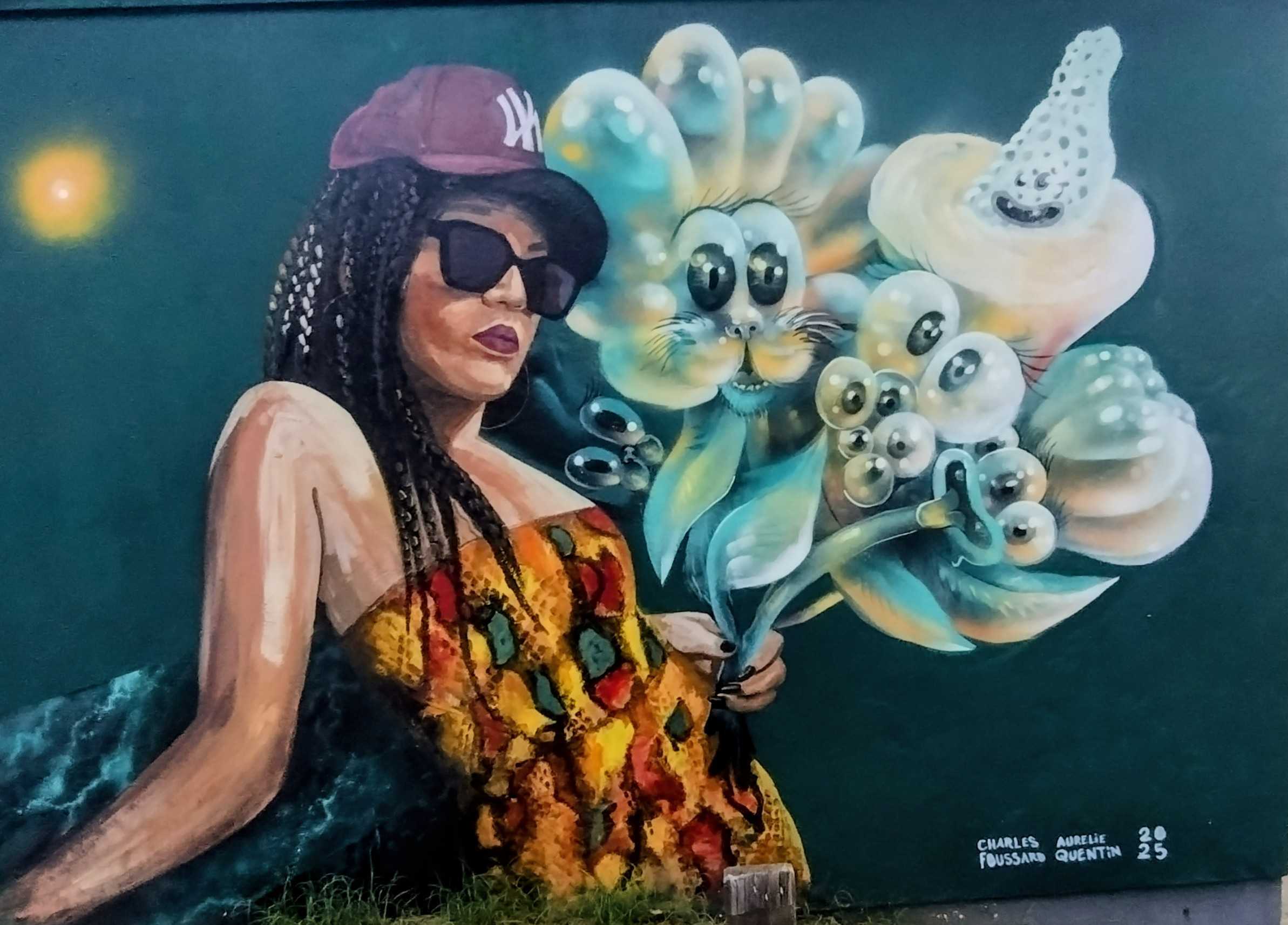 The artwork is of graffiti type. You can admire it in the city of Saint-Paul in Réunion and more precisely here : 1 Rue Surcouf, Saint-Paul 97460, Réunion.