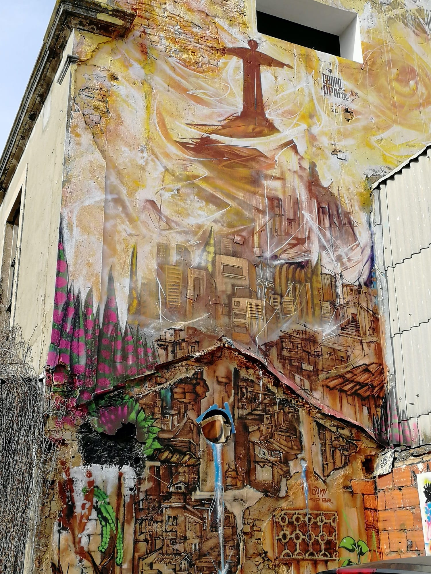 The artwork is of graffiti type. You can admire it in the city of Lisboa in Portugal and more precisely here : R. Rodrigues de Faria 103, 1300-501 Lisboa, Portugal.