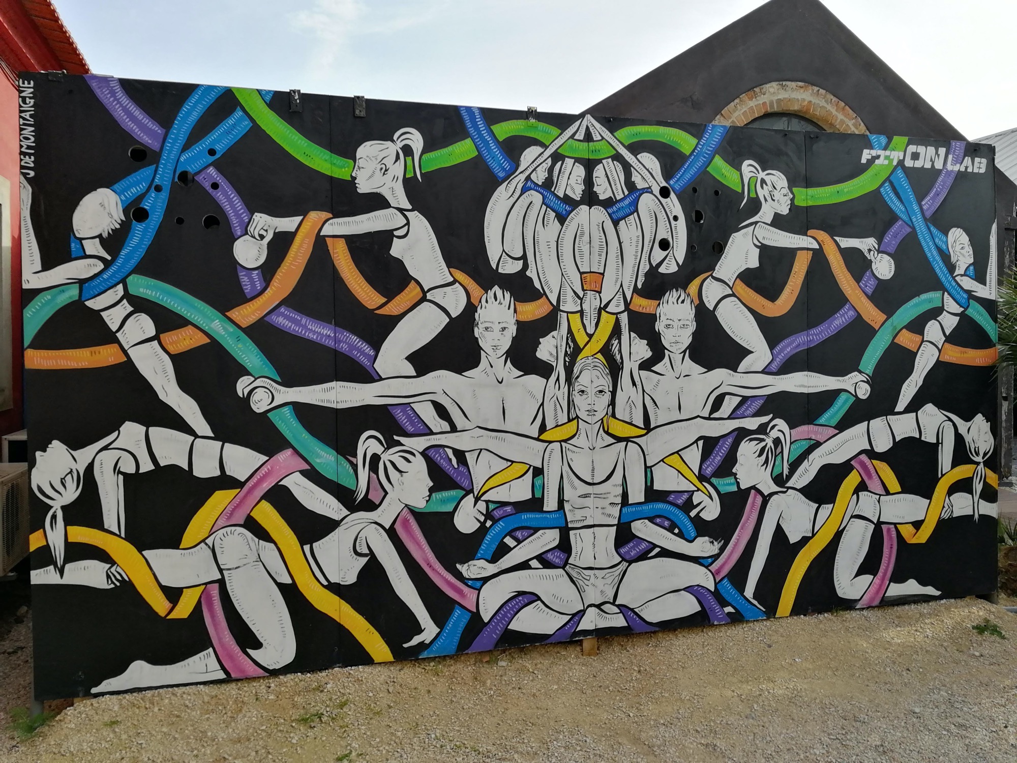 The artwork is of graffiti type. You can admire it in the city of Lisboa in Portugal and more precisely here : R. Rodrigues de Faria 105, 1300-501 Lisboa, Portugal.