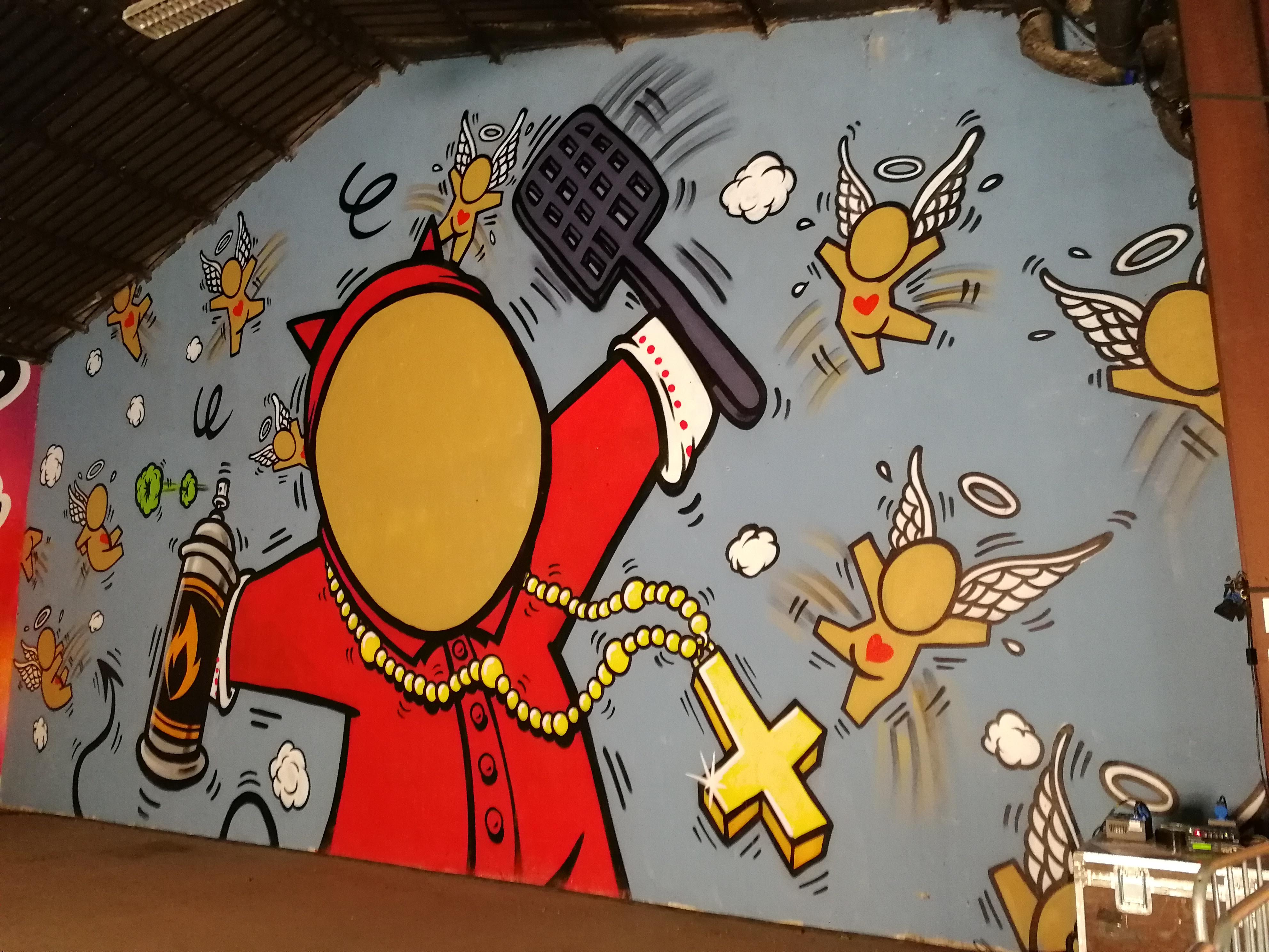 Fabien, aka Le Môme, has been drawing since the college days. It is natural that he became an artist, specialized in muralism and spray. Active in Lyon since 2001, his pop universe and his madness express themselves through original decorations. His concept is innovative for the community: street art in home delivery. One often finds on his personalized walls tributes to superheroes of cartoons and great figures of music. Le Môme is a chameleon bomb that adapts to all universes.