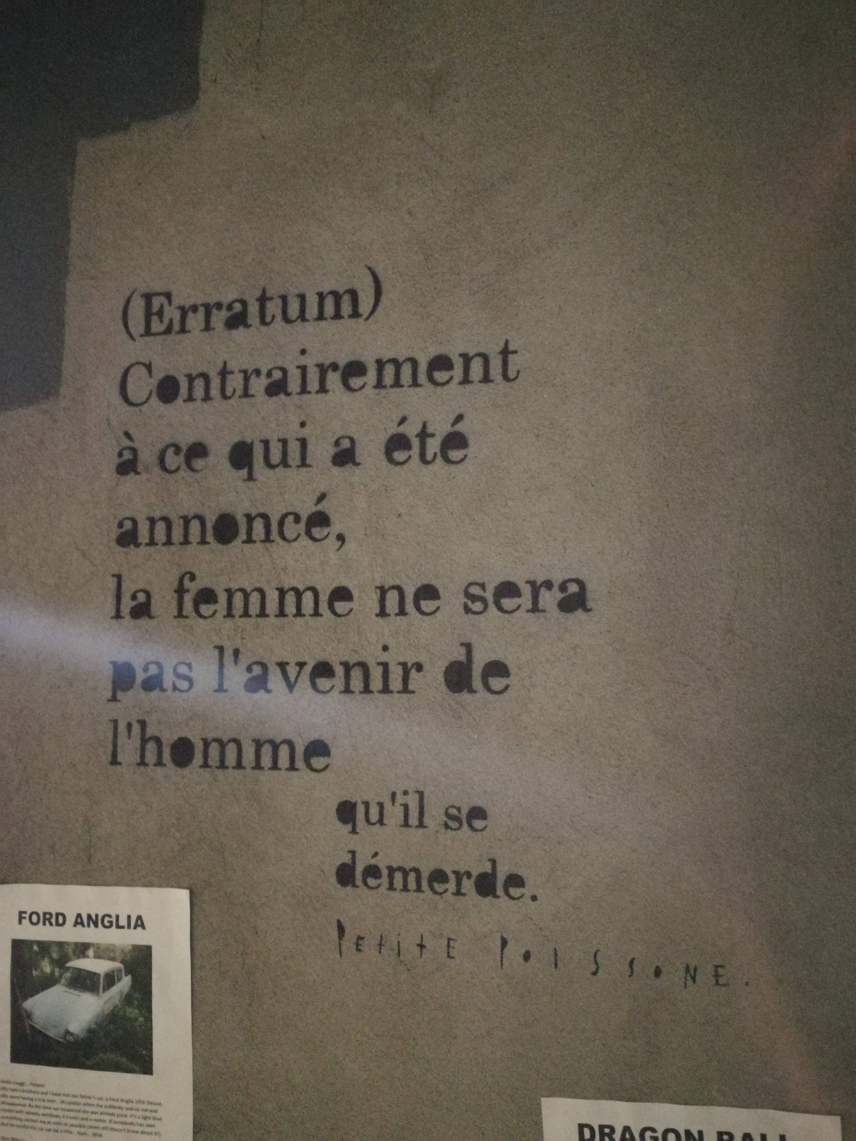 Petite Poissone writes more than she draws. She scribbles notes in notebooks then sticks her aphorisms in the street. Her governing principle: the break and the shift, as much on the form as on the bottom. Very clean texts, cut and aligned to the millimeter, stuck on the dirty walls of the street, sweet words in the collective unconscious (proverbs, popular songs) diverted sometimes vulgar way, feminist messages adorning iconic household utensils the housewife of the 50's ... and humor!