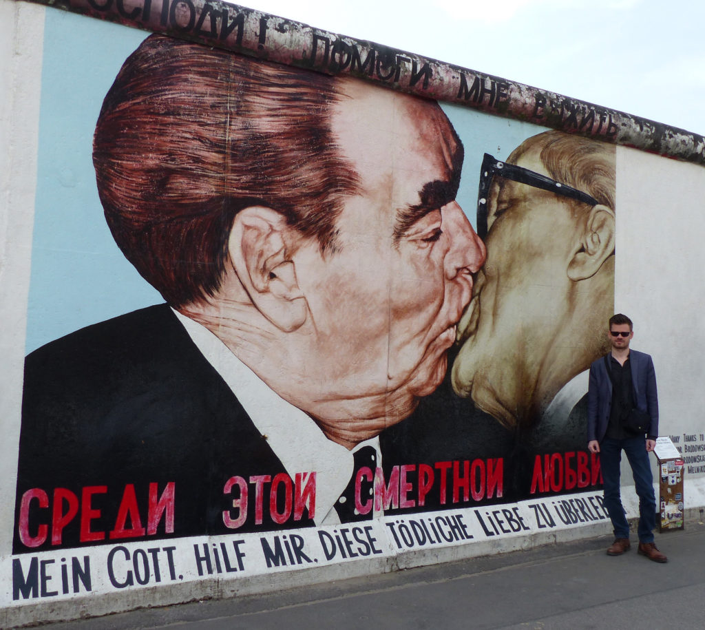 This mural depicts the famous socialist fraternal kiss between the leader of the USSR Leonid Brezhnev and the leader of the German Democratic Republic (GDR), Erich Honecker.
