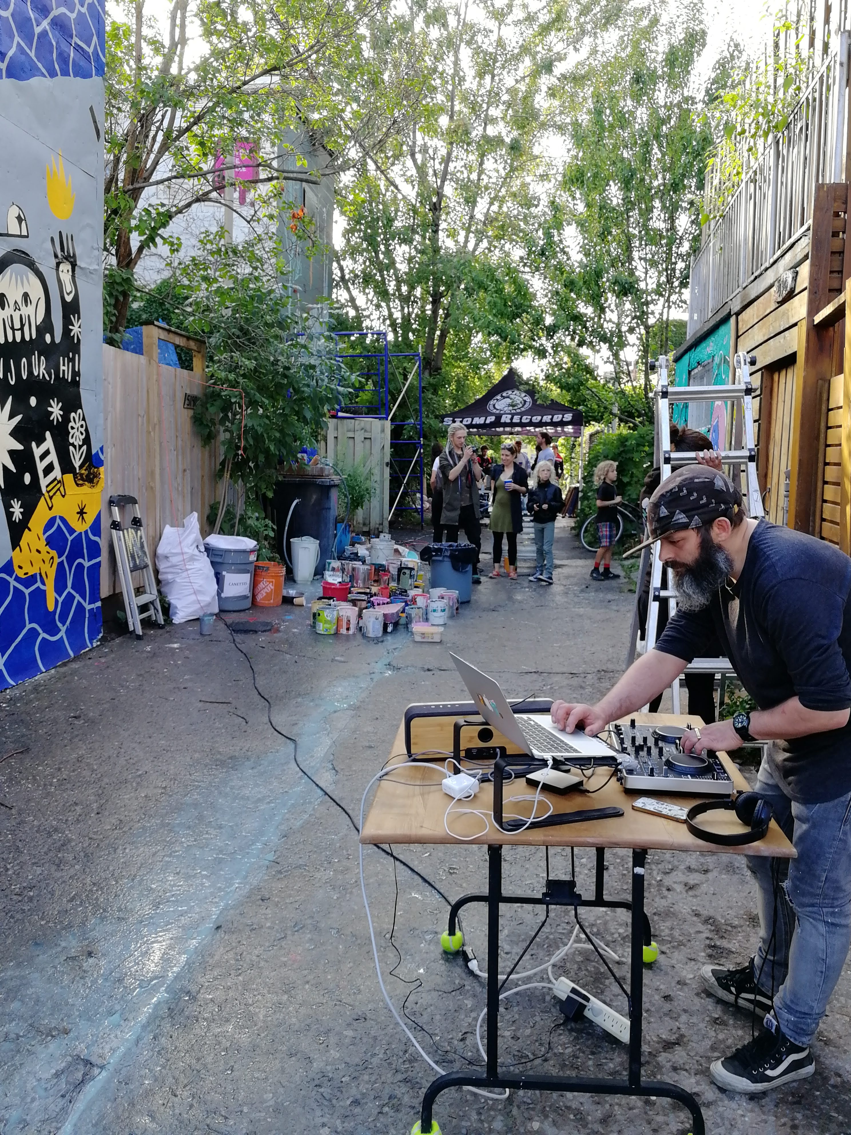 Here are some pictures of the artists in action and installations in the holiday camp style with DJ, food and drink :)