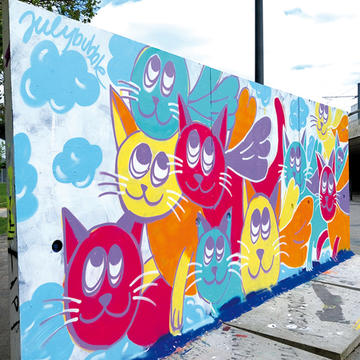 JulyBubble dessine et colle dans les rues d'Angers son personnage "Mon Chat volant". Ce chat ailé prend s'inspire de la culture pop et des mangas, tout en jouant avec humour sur des références classiques : des chimères mythologiques aux peintures célèbres, en passant par le monde du street art.