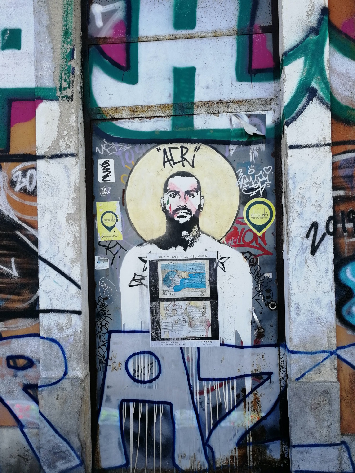 L’oeuvre est de type graffiti. Vous pouvez l’admirer dans la ville de Almada en Portugal et plus précisément ici : R. do Ginjal 22, 2800-270 Almada, Portugal.