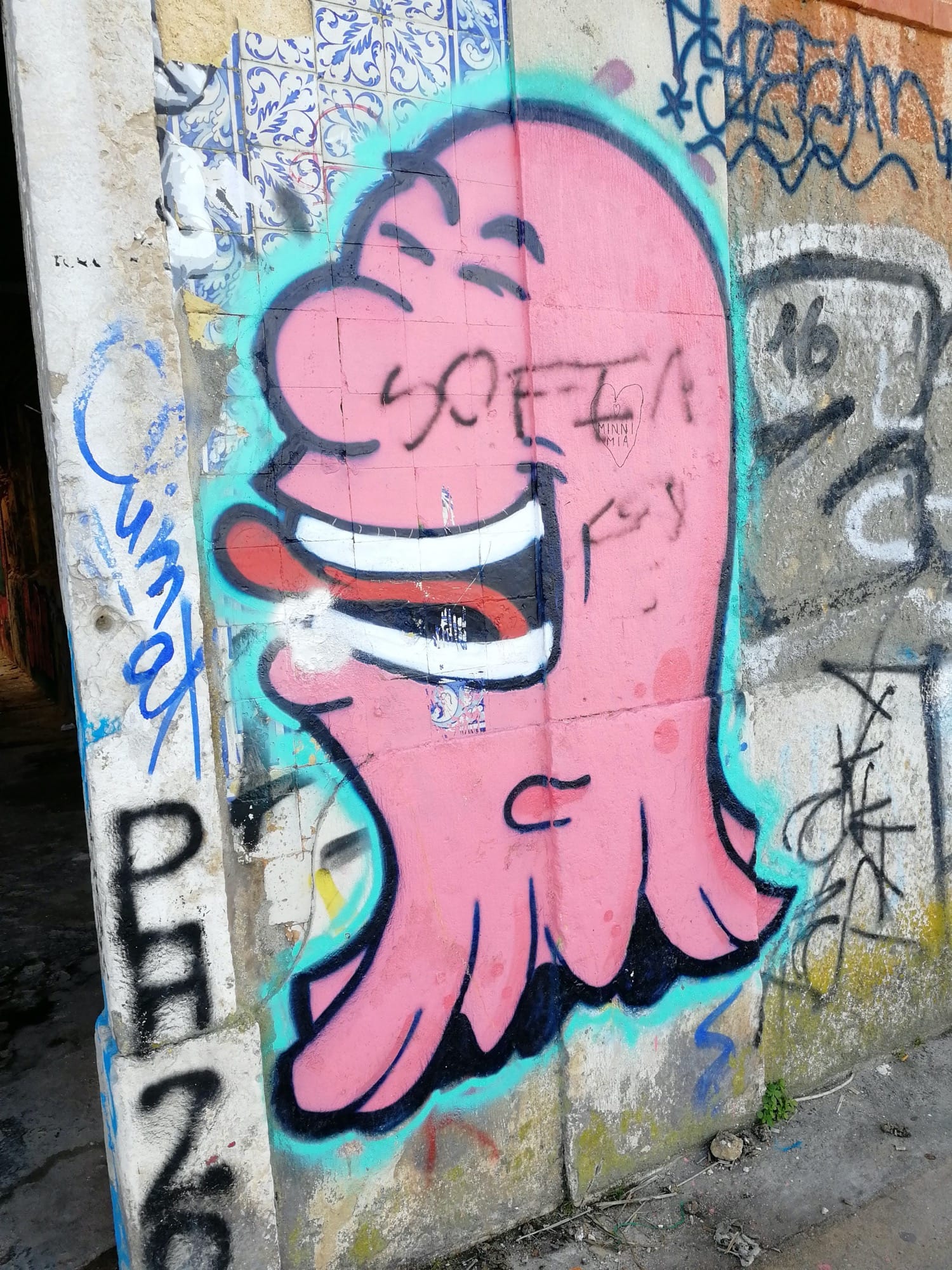 L’oeuvre est de type graffiti. Vous pouvez l’admirer dans la ville de Lisboa en Portugal et plus précisément ici : R. do Ginjal, Portugal.