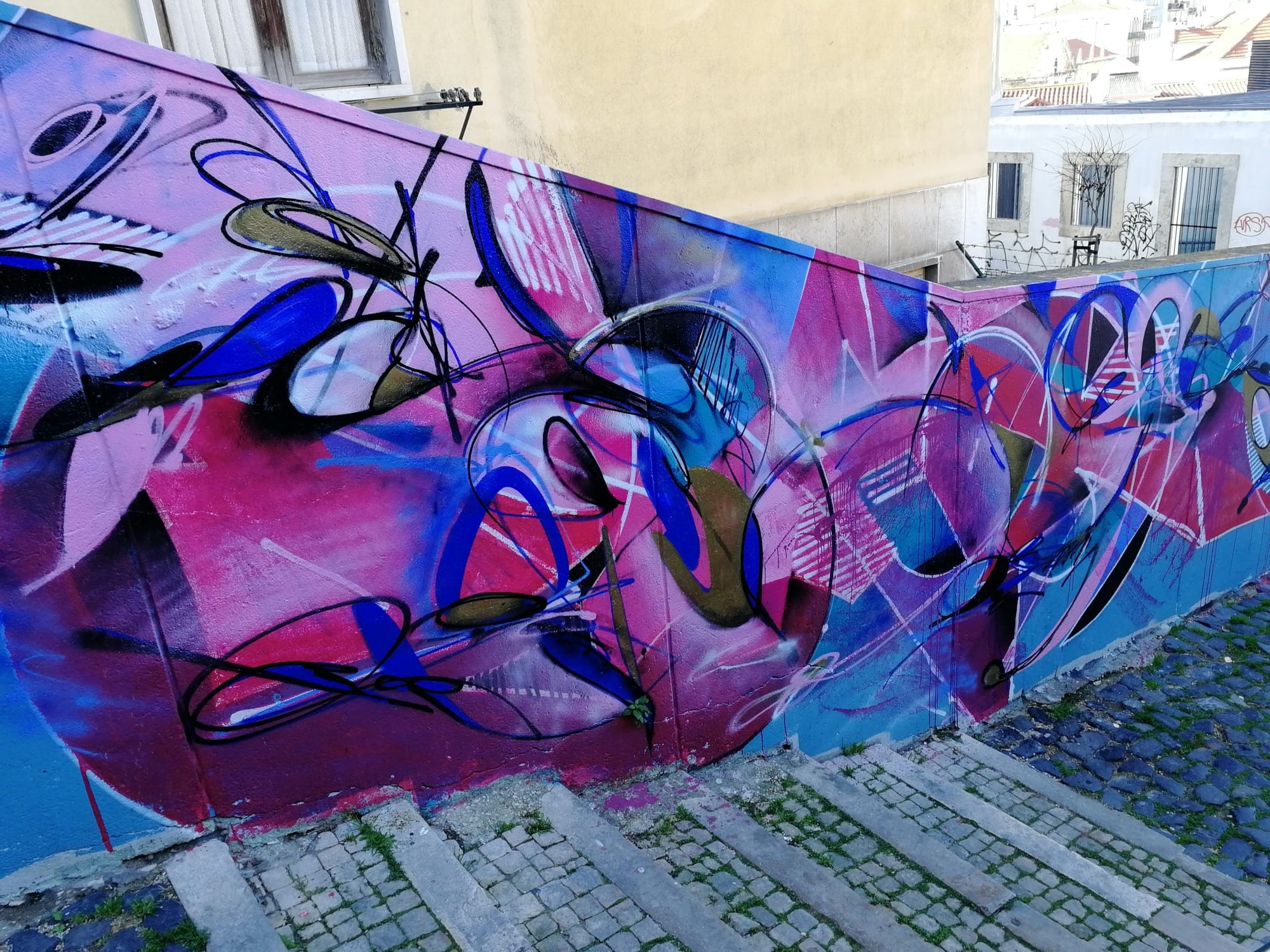 L’oeuvre est de type graffiti. Vous pouvez l’admirer dans la ville de Lisboa en Portugal et plus précisément ici : Rua dos Lagares 22, 1100-595 Lisboa, Portugal.