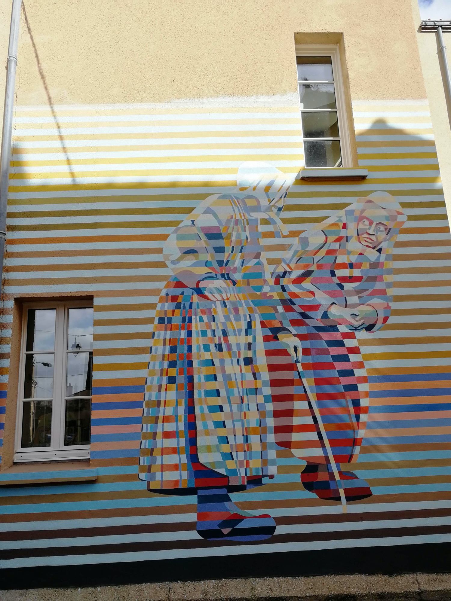 L’oeuvre est de type graffiti. Vous pouvez l’admirer dans la ville de Redon en France et plus précisément ici : 8 Rue du Jeu de Paume, 35600 Redon, France.