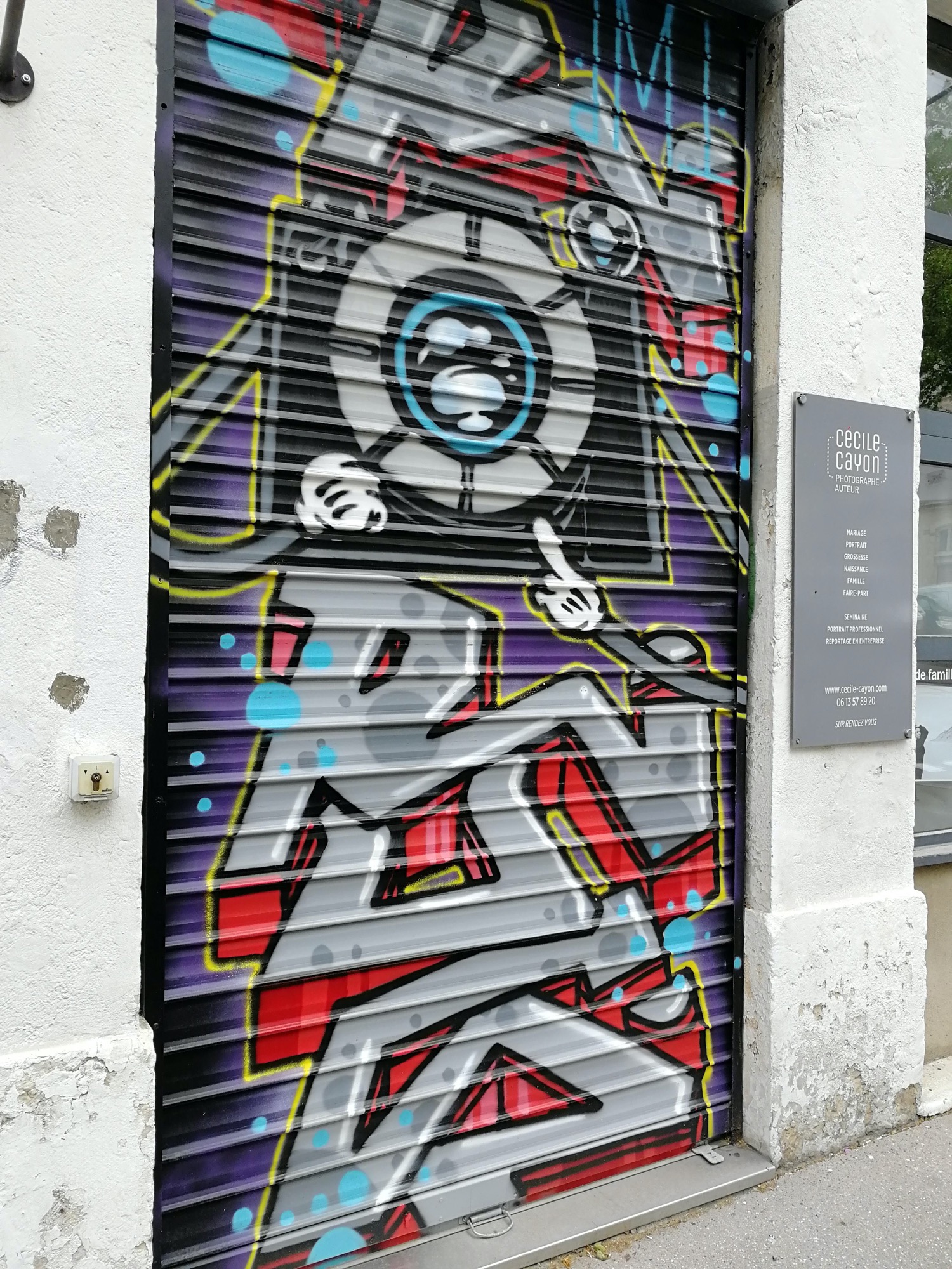 L’oeuvre est de type graffiti. Vous pouvez l’admirer dans la ville de Lyon en France et plus précisément ici : 13 Rue Claudius Linossier, 69004 Lyon, France.