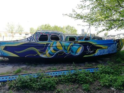 L'oeuvre est de type graffiti. Vous pouvez l'admirer dans la ville de Amsterdam en Netherlands et plus précisément ici : NDSM-Plein 86a, 1033 WB Amsterdam, Pays-Bas.