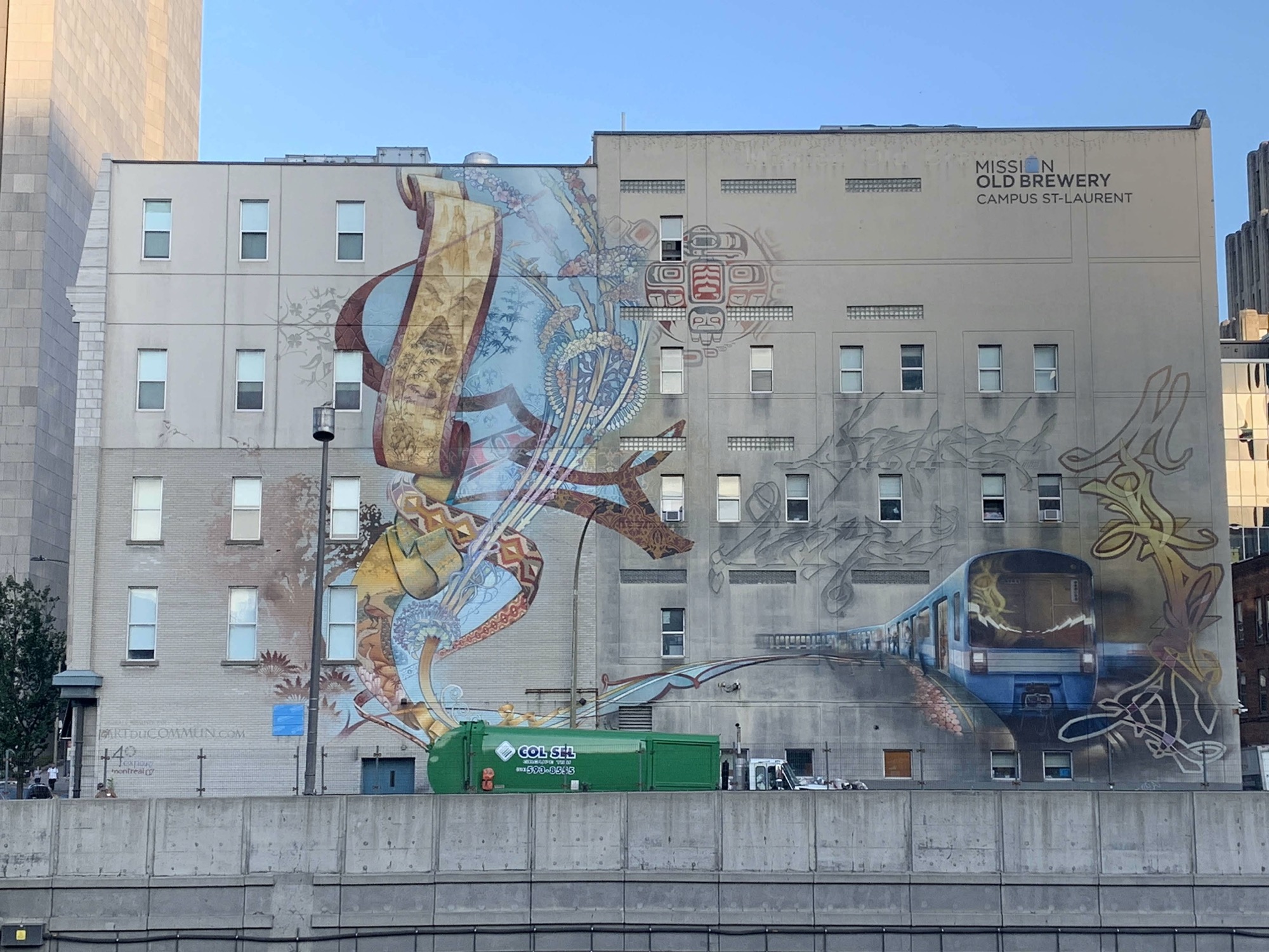 L’oeuvre est de type graffiti. Vous pouvez l’admirer dans la ville de Montréal en Canada et plus précisément ici : 19 Avenue Viger O, Montréal, QC H2Z 1J4, Canada.