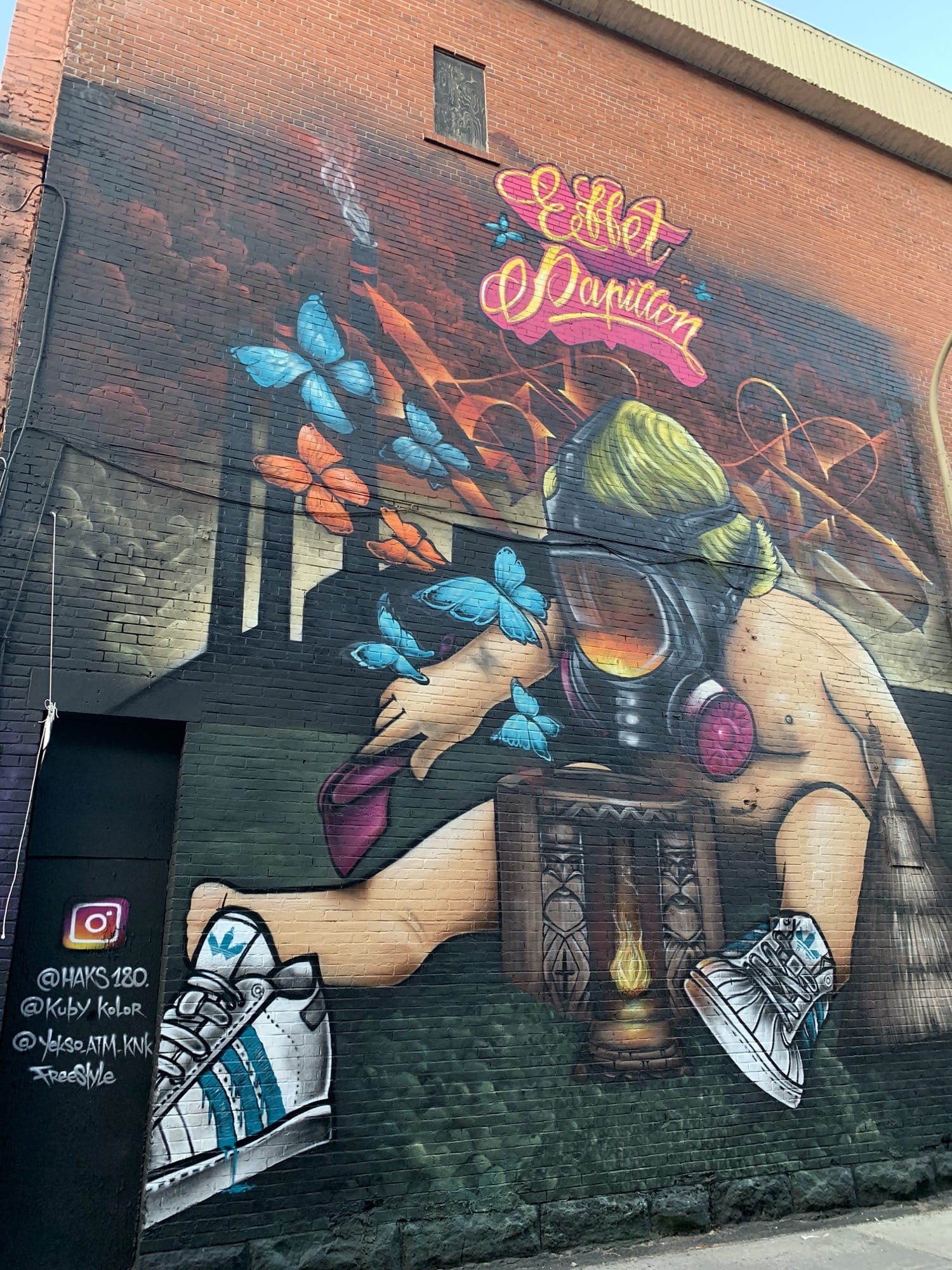 L’oeuvre est de type graffiti. Vous pouvez l’admirer dans la ville de Montréal en Canada et plus précisément ici : 153 Rue Sainte-Catherine E, Montréal, QC H2X 1K8, Canada.