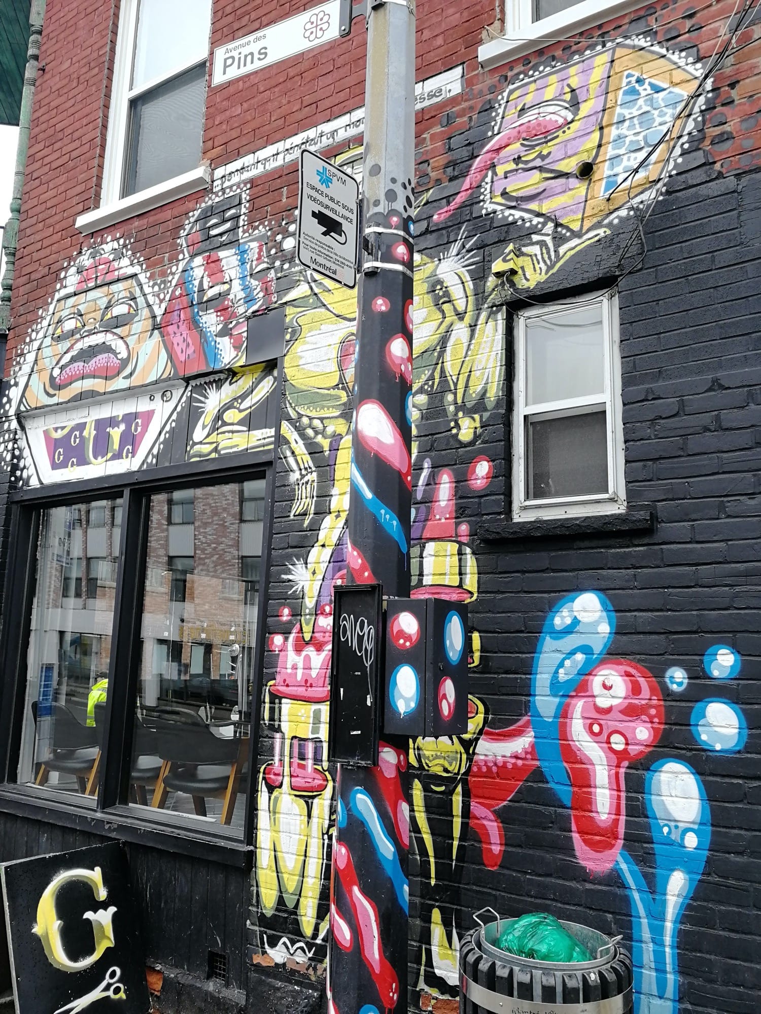 L’oeuvre est de type graffiti. Vous pouvez l’admirer dans la ville de Montréal en Canada et plus précisément ici : 28 Rue Saint-Dominique, Montréal, QC H2W 1N3, Canada.
