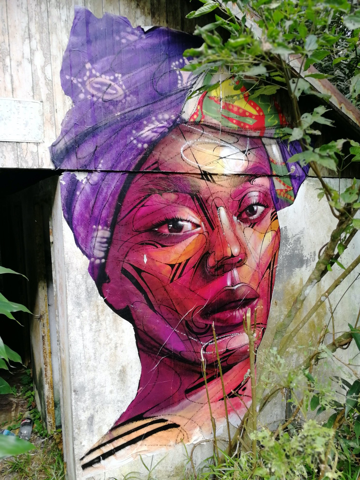 L’oeuvre est de type graffiti. Vous pouvez l’admirer dans la ville de Saint-Joseph en Réunion et plus précisément ici : 43 Route de Grand Galet, Réunion.