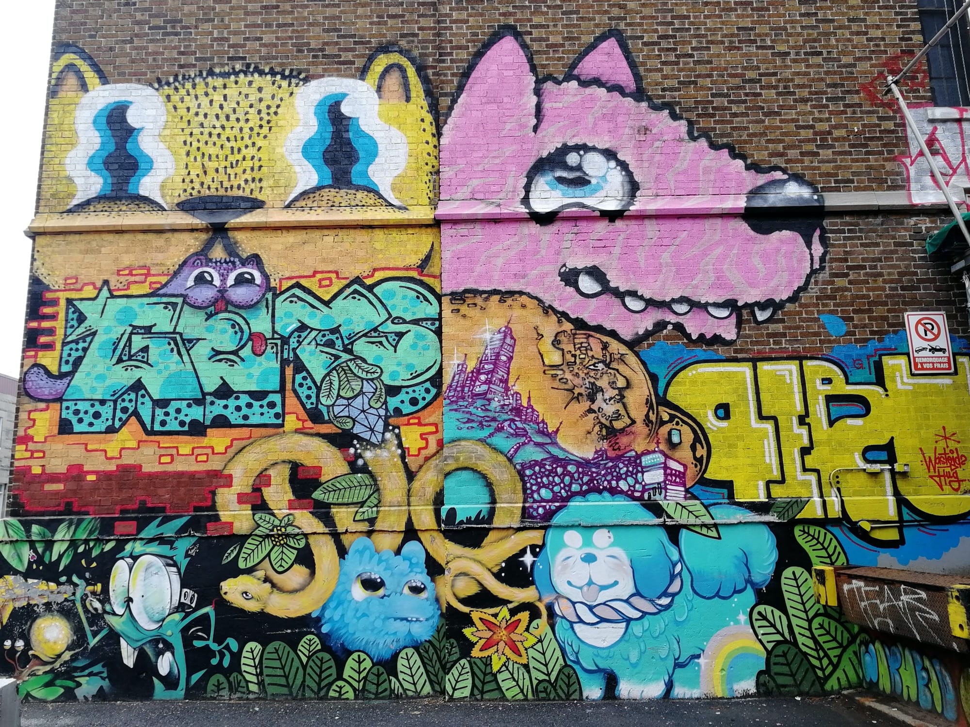 L’oeuvre est de type graffiti. Vous pouvez l’admirer dans la ville de Montréal en Canada et plus précisément ici : 4221 Rue Clark, Montréal, QC H2W 1X2, Canada.