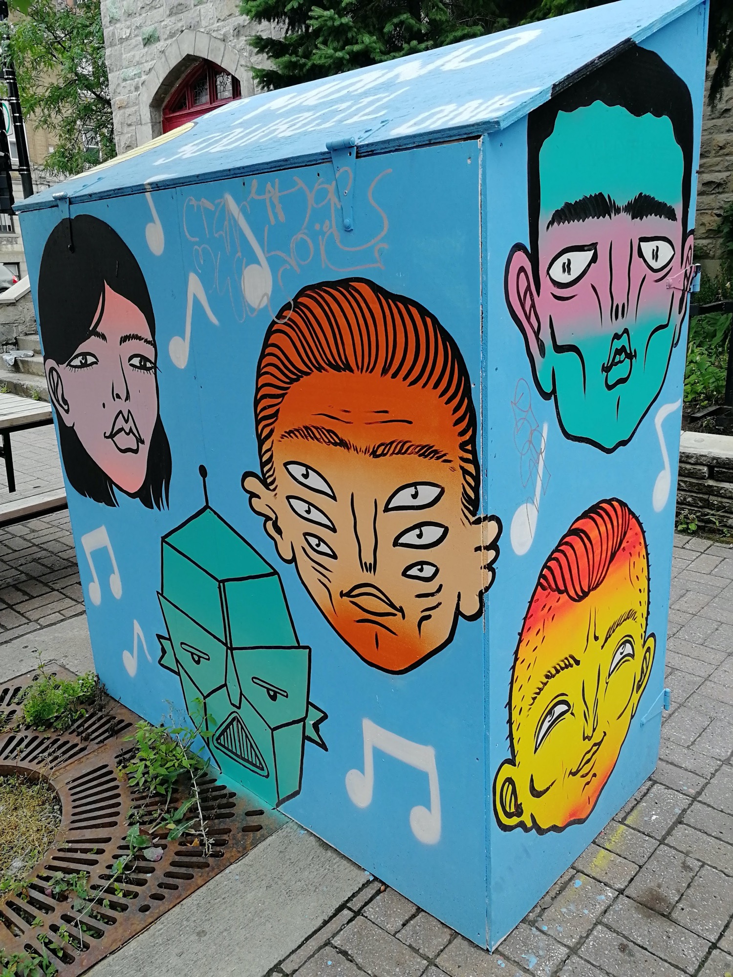 L’oeuvre est de type graffiti. Vous pouvez l’admirer dans la ville de Montréal en Canada et plus précisément ici : 405 Rue Marie-Anne, Montréal, QC H2J 2M8, Canada.