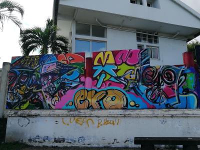 L'oeuvre est de type graffiti. Vous pouvez l'admirer dans la ville de Saint-Pierre en Réunion et plus précisément ici : 145 Rue Victor le Vigoureux, Saint-Pierre, Réunion.