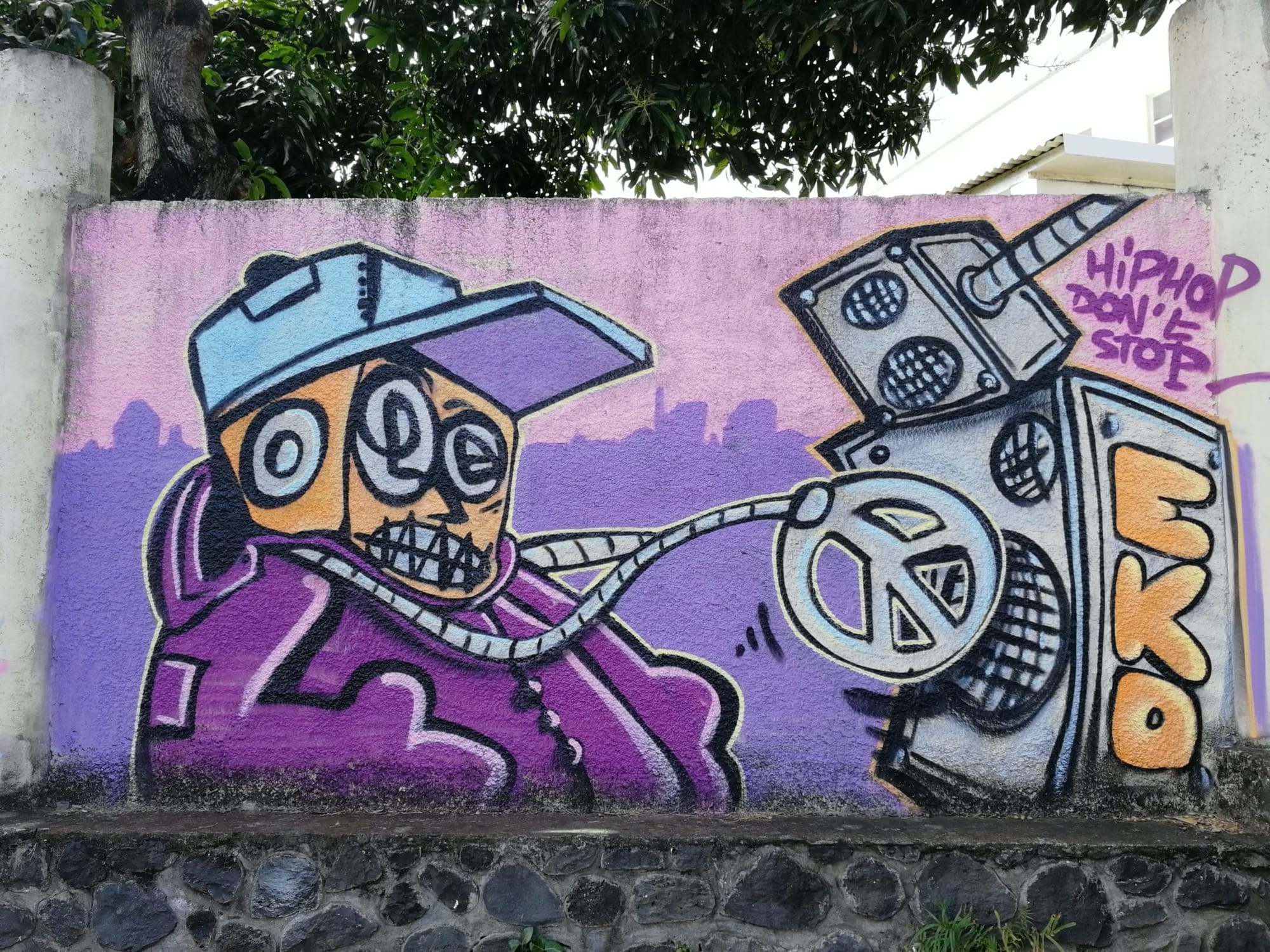 L’oeuvre est de type graffiti. Vous pouvez l’admirer dans la ville de Saint-Pierre en Réunion et plus précisément ici : 145 Rue Victor le Vigoureux, Saint-Pierre, Réunion.