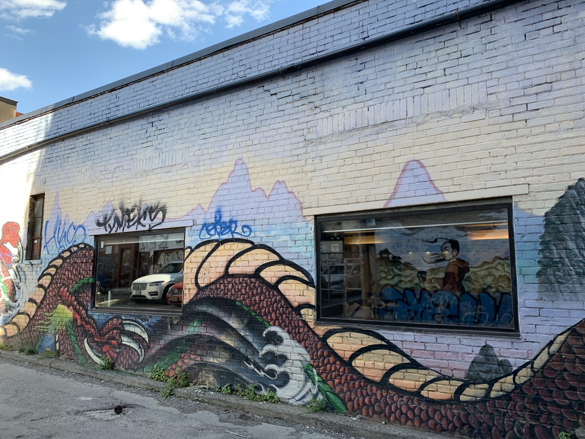 L’oeuvre est de type graffiti. Vous pouvez l’admirer dans la ville de Toronto en Canada et plus précisément ici : 490 Dundas St W, Toronto, ON M5T 1H1, Canada.