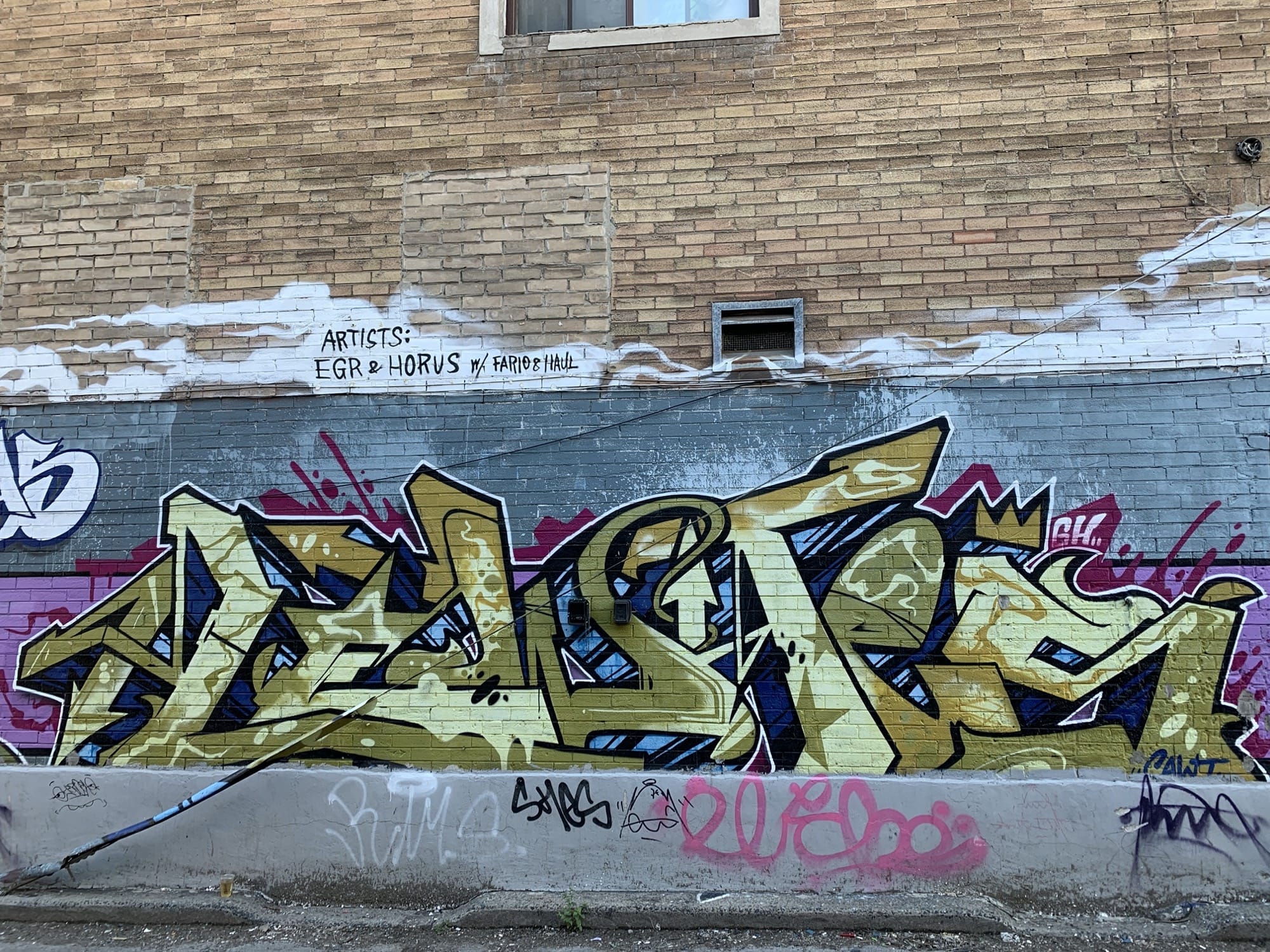 L’oeuvre est de type graffiti. Vous pouvez l’admirer dans la ville de Toronto en Canada et plus précisément ici : 490 Dundas St W, Toronto, ON M5T 1H1, Canada.